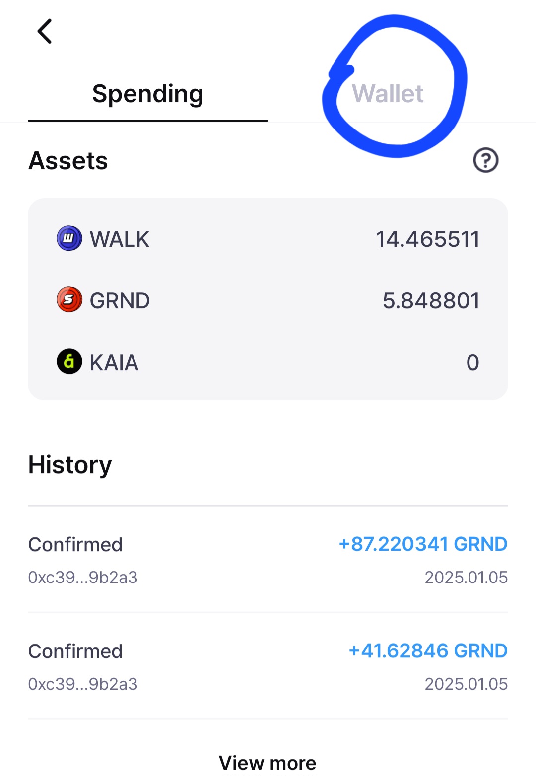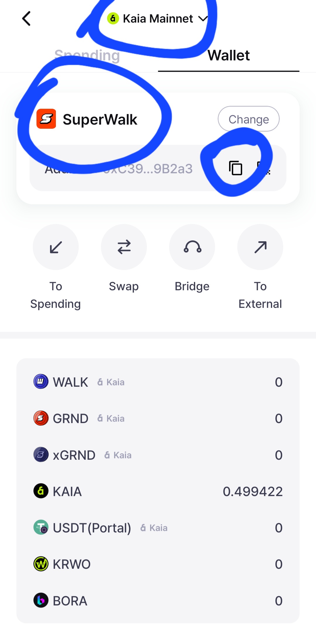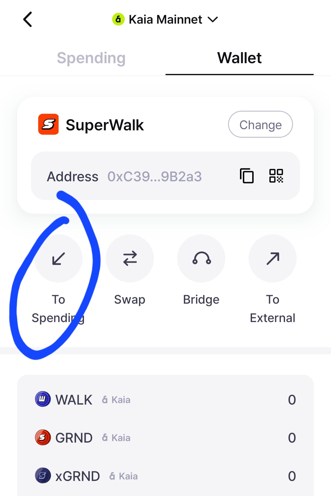 কিছুক্ষণের মধ্যে withdraw হয়ে যাবে। এরপর আমরা আবারও super walk প্রবেশ করব৷ সেখানে to spending নামে একটি অপশন রয়েছে সেখানে ক্লিক দিব। এরপর আমরা আমাদের যে কয়েন এখানে প্রবেশ করেছে সেটি এখানে পাঠিয়ে দিব। সেই kaia কয়েন থেকে আমরা grand কয়েনে swap করে নিব।