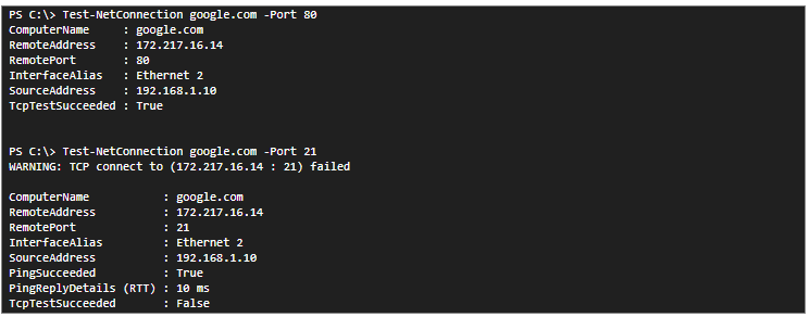 After adding the -Port parameter and the port number, we check if the port is open or not. In the case of Google.com, port 80 is open and port 21 is closed.