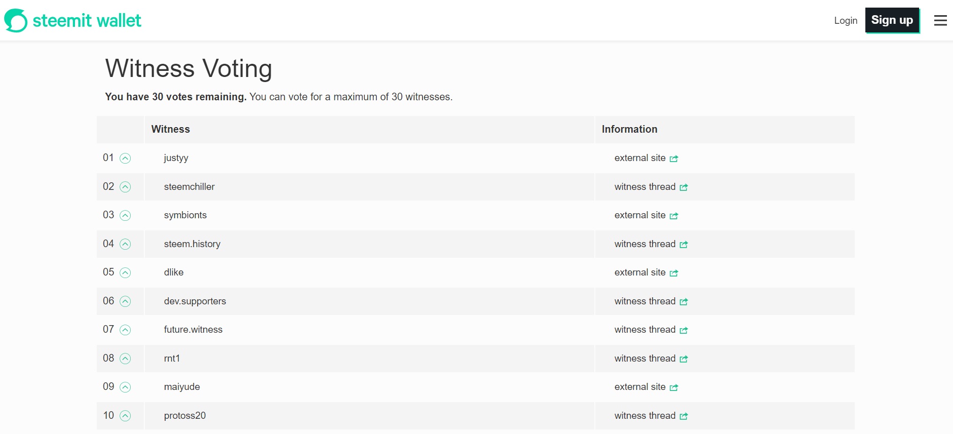 তারপর Witness Voting ইউন্ডোটি ওপেন হবে, এখানে সিরিয়ালি এক হতে একশ পর্যন্ত Wintess লিষ্ট রয়েছে। এখন আপনাকে আপনার এ্যাকটিভ কি দিয়ে লগ-ইন করতে হবে, এখান হতে কাউকে ভোট দেয়ার জন্য।