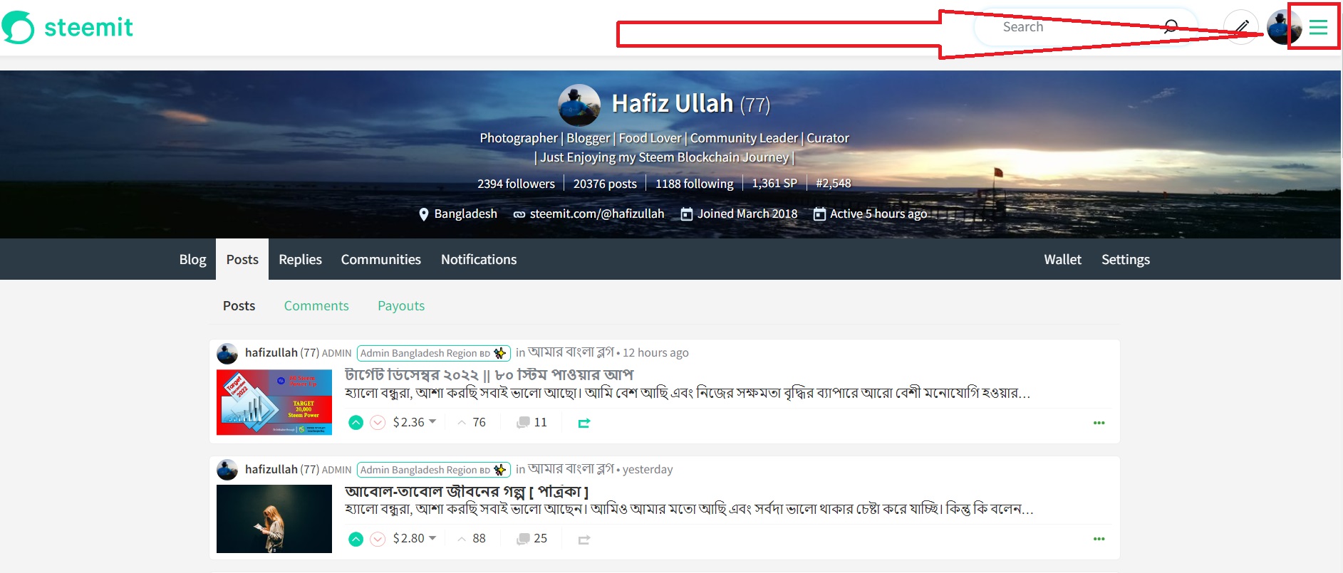 প্রথমে আপনাকে https://steemit.com/@hafizullah আপনার স্টিমিট আইডির পেইজটি ওপেন করতে হবে তারপর সেখান হতে একদম উপরের দিকে ডান পাশে তিনটি সোজা দাগ দেয়া আছে সেখানে ক্লিক করতে হবে। উপরের ছবিটি দেখুন।