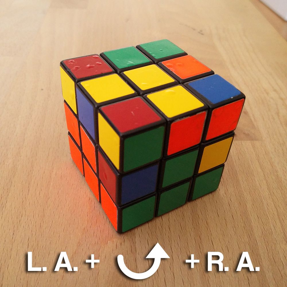 We can swap two adjacent corners if they are on the right. To do this, we perform 3x the Righty Alg, spin the entire cube 90° clockwise around its vertical axis and then do 3x the Lefty Alg.