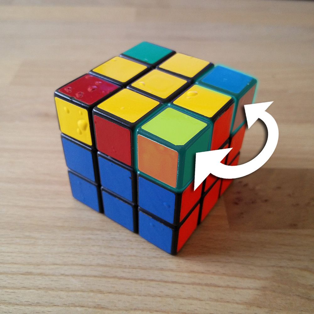 Let's now move on to the orientation of the corners. We position the cube so that the corner to be adjusted is at the bottom right. Now we repeat the Righty Alg until the yellow sticker of the corner faces down. Then we only turn the bottom layer (!) until a new corner is down right, and we perform the same thing again.