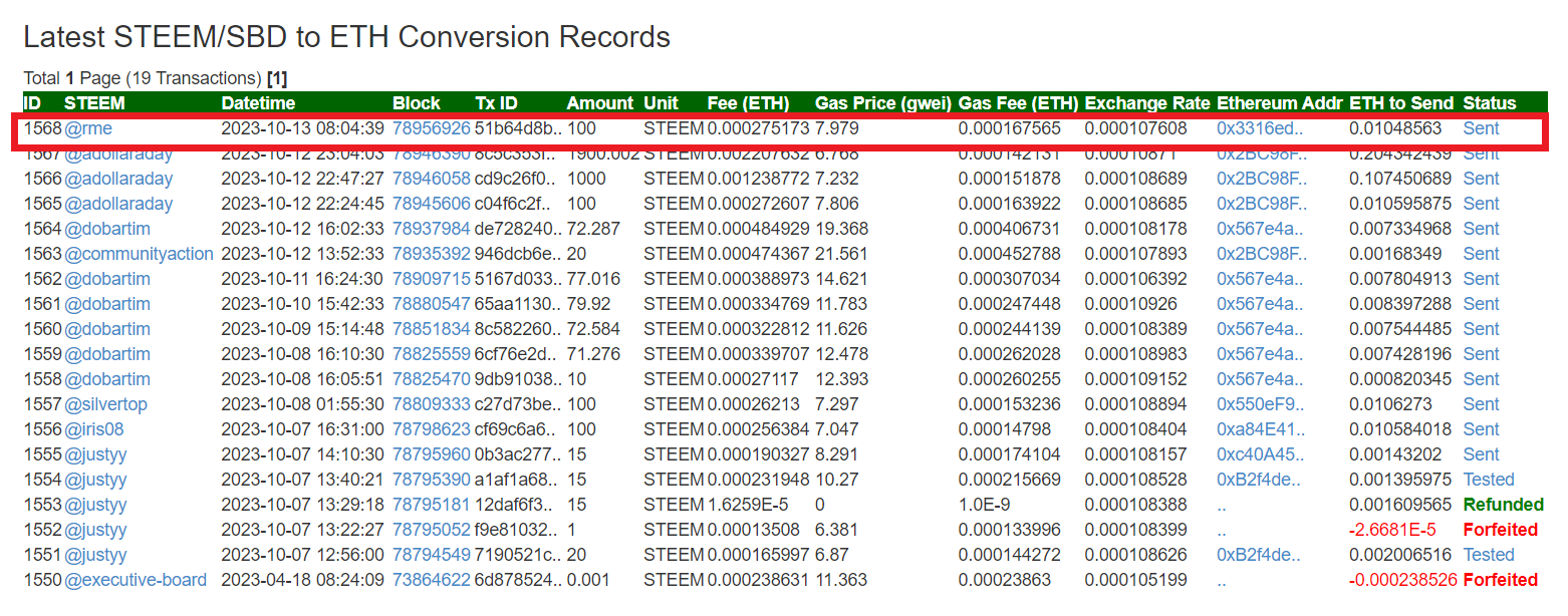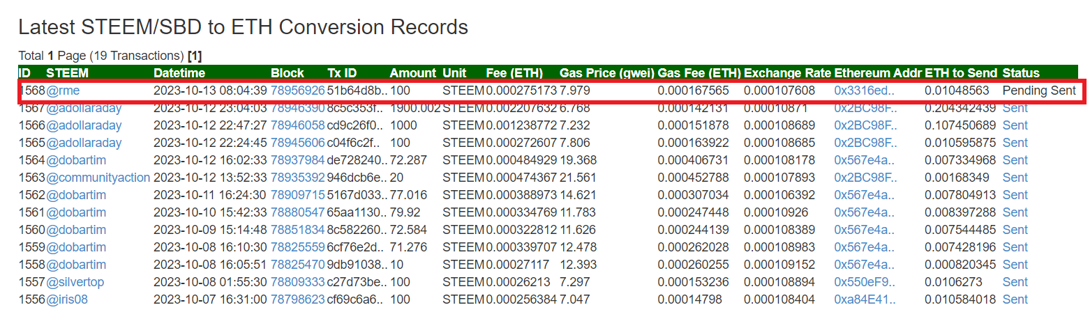 ➤ ট্রান্সফার করার পরে আপনার এক্সচেঞ্জটির স্ট্যাটাস পেতে "Latest STEEM/SBD to ETH Conversion Records" সেকশন এ চেক করুন । steem ট্রান্সফার করার পরে ১-২ মিনিট পরে পেজটি রিফ্রেশ করুন ।