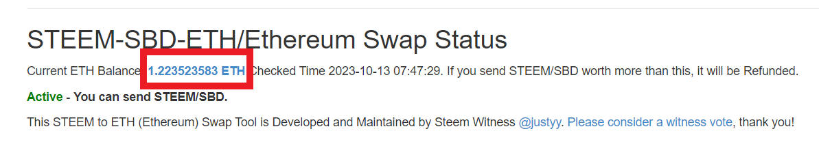 ➤ এই পেজটি ওপেন হবে - https://steemyy.com/steem2eth.php । এবারে নিচের স্ক্রিনশটটি লক্ষ করুন । আপনি কত ইথারিয়াম পেতে চান সেটা swap pool এর available ব্যালেন্স কভার করছে কি না সেটা ফার্স্ট চেক করে নেবেন । আপনার desired ইথারিয়াম available ব্যালান্স এর অতিরিক্ত হলে এক্সচেঞ্জ রিকুয়েস্টটা অটো ক্যান্সেল হবে এবং আপনি রিফান্ড পেয়ে যাবেন ।