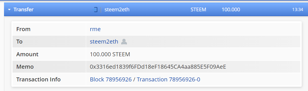 ➤নিচের স্ক্রিনশট দু'টি খুব ভালো করে লক্ষ করুন । আমি আমার একাউন্ট @rme থেকে 100 steem ট্রান্সফার করেছি @steem2eth একাউন্টে এবং memo হিসেবে আমার ETH এডড্রেসটি দিয়েছি ।