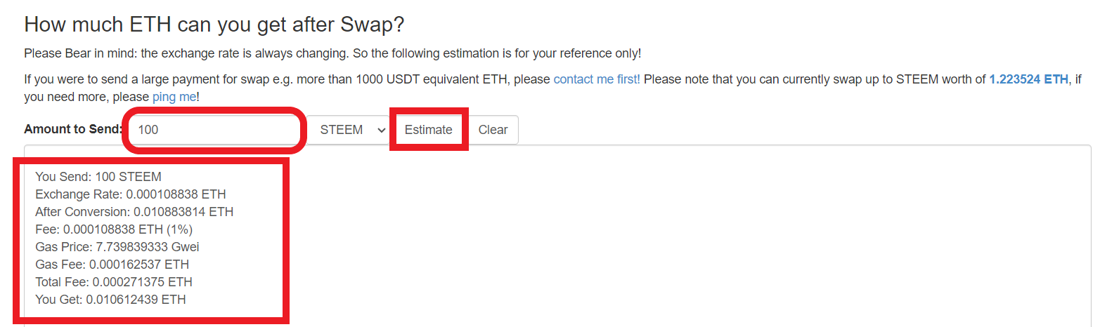 Amount এর ঘরে আপনি কত steem এক্সচেঞ্জ করতে চান সেটি লিখে ডান পাশের Estimate বাটনে ক্লিক করে এক্সচেঞ্জ এর পুরো এস্টিমেটটা পেতে পারেন । আমি যেমন এখানে 100 steem লিখে Estimate বাটনে ক্লিক করে নিম্নলিখিত এস্টিমেশনটা পেয়েছি :