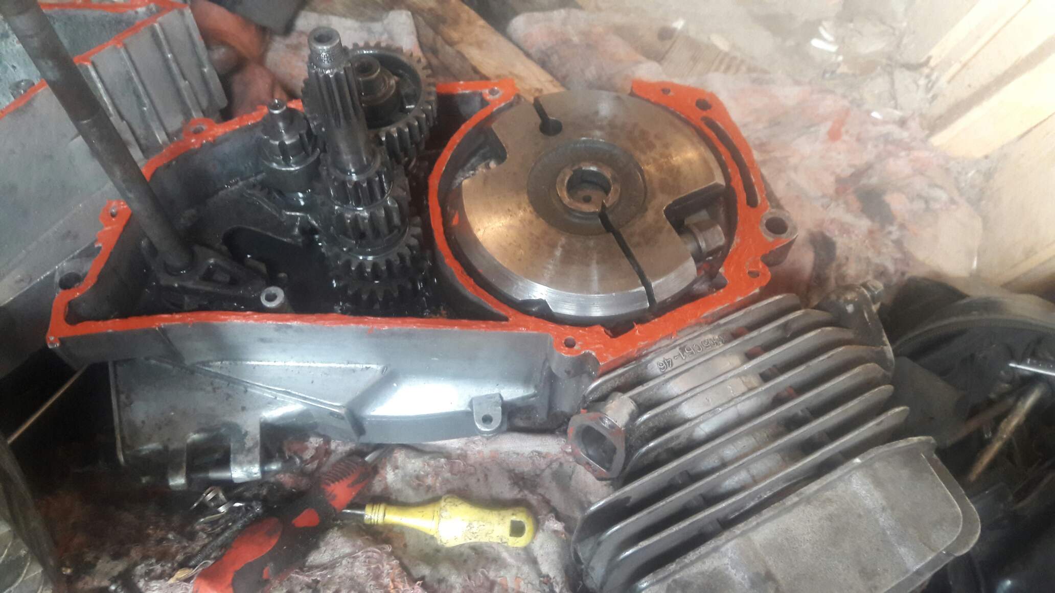 розібраний двигун"іж юпітер-5".видно:маховик,і коробка передач.