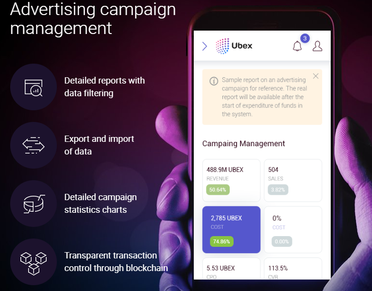 Ubex will provide advertisers complete manage over their campaigns, such as particular reports and records filtering, information importing and exporting, certain campaign records charts, and transparent transaction manipulates thorough blockchain.