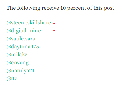I mentioned that there were two extras. I included @steem.skillshare, the curation account for that community, and @digital.mine to increase promotion. As the concept spreads, the beneficiaries would be encouraged to create new groups and including the Leader as one of the spares and the Leader of a second group the member might be part of.