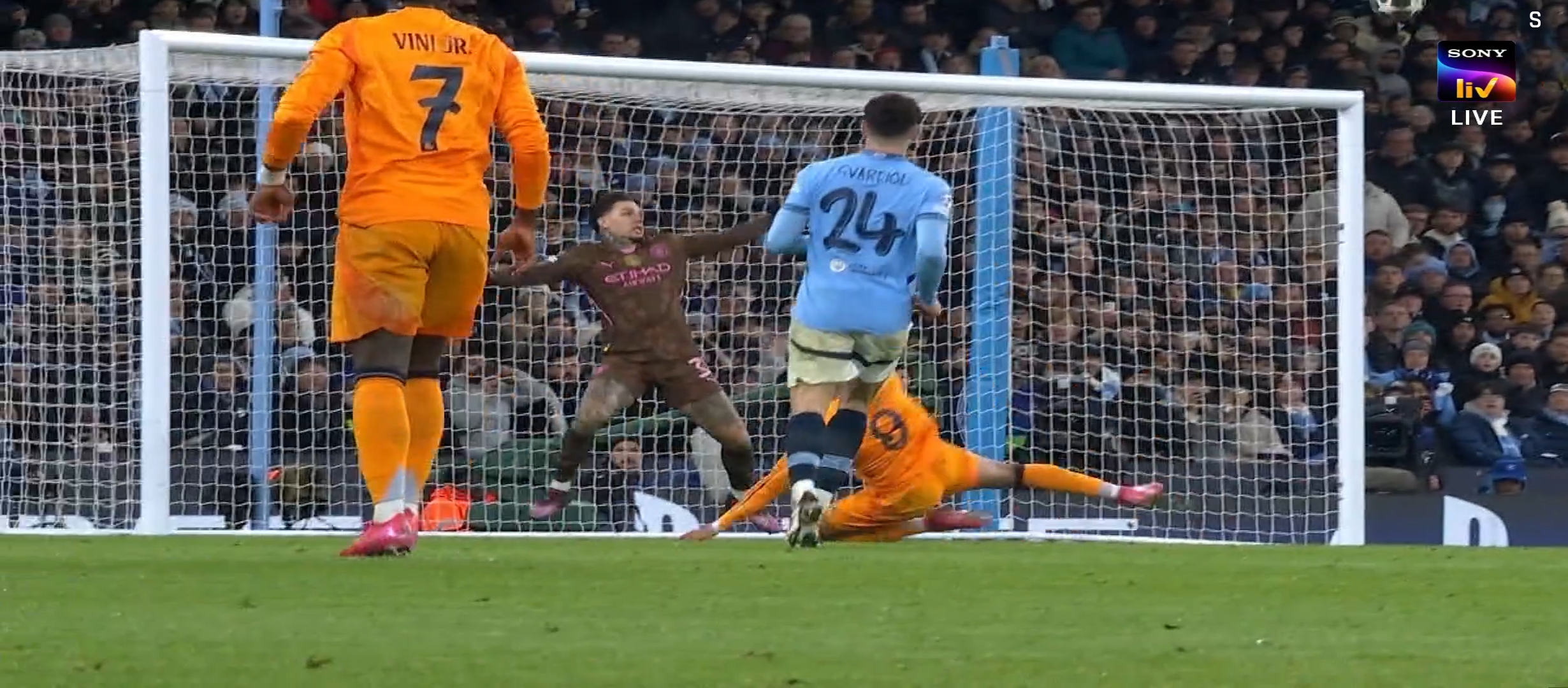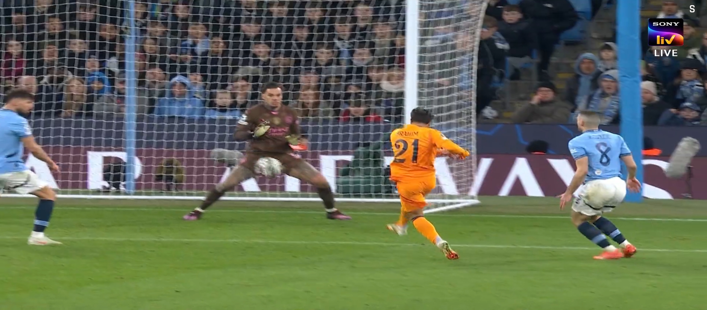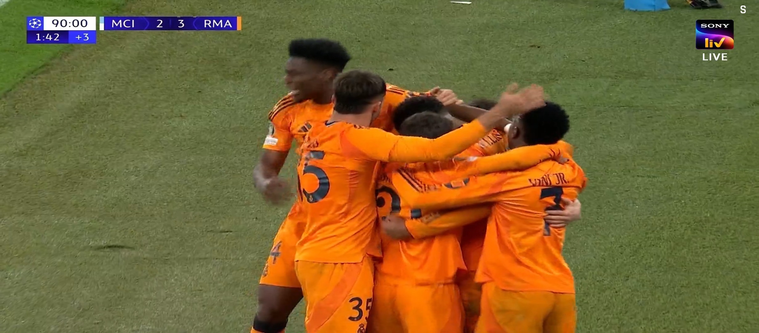 এই গোলের পরে পুরো ইওিহাদ স্টেডিয়াম যেন চুপ হয়ে যায় । অতিরিক্ত সময়ের খেলা চলছে তখন। সিটি ডিফেন্ডার দের থেকে দারুণ কৌশলে বল নিয়ে দূরন্ত গতিতে সিটির আক্রমণভাগে ছুটে যায় ভিনিসিয়াস। সিটি গোলকিপার এডারসন এগিয়ে আসলে ভিনিসিয়াস তার মাথার উপর দিয়ে বল তুলে দেয়। বল চলে যায় গোলবারের সামনে। সেখান থেকে একেবারে সহজ একটা ফিনিশিং করে জুড বেলিংহাম। ম্যাচের ৯২ মিনিটে প্রথমবার লিড পাই রিয়াল মাদ্রিদ। পুরো সিটি ফ্যান চুপ হয়ে যায়। কিছুক্ষণ পর খেলা শেষ হলে জয় নিয়ে মাঠ ছাড়ে রিয়াল মাদ্রিদ। সিটির ঘরের মাঠে এইরকম ইঞ্জুরি জর্জরিত দল নিয়ে জো নিয়ে আসাটা অনেক বড় ব্যাপার। ম্যাচে সর্বোচ্চ দুই অ্যাসিস্ট করে ম্যাচ সেরা হয় ভিনিসিয়াস। দ্বিতীয় লেগের খেলা এই মাসের ২০ তারিখে। তবে স্বস্তির ব্যাপার ঐটা হবে রিয়ালের ঘরের মাঠ সান্তিয়াগো বার্নাব্যুতে।