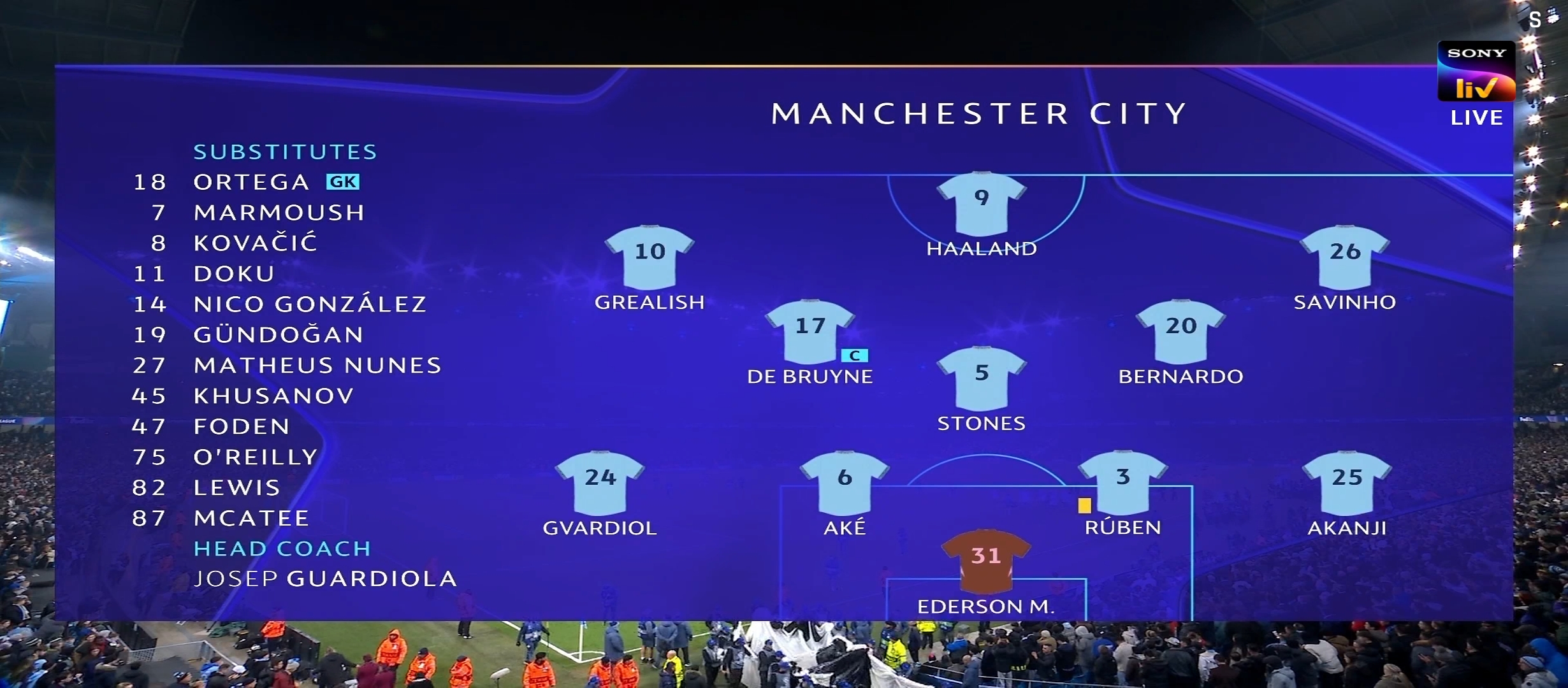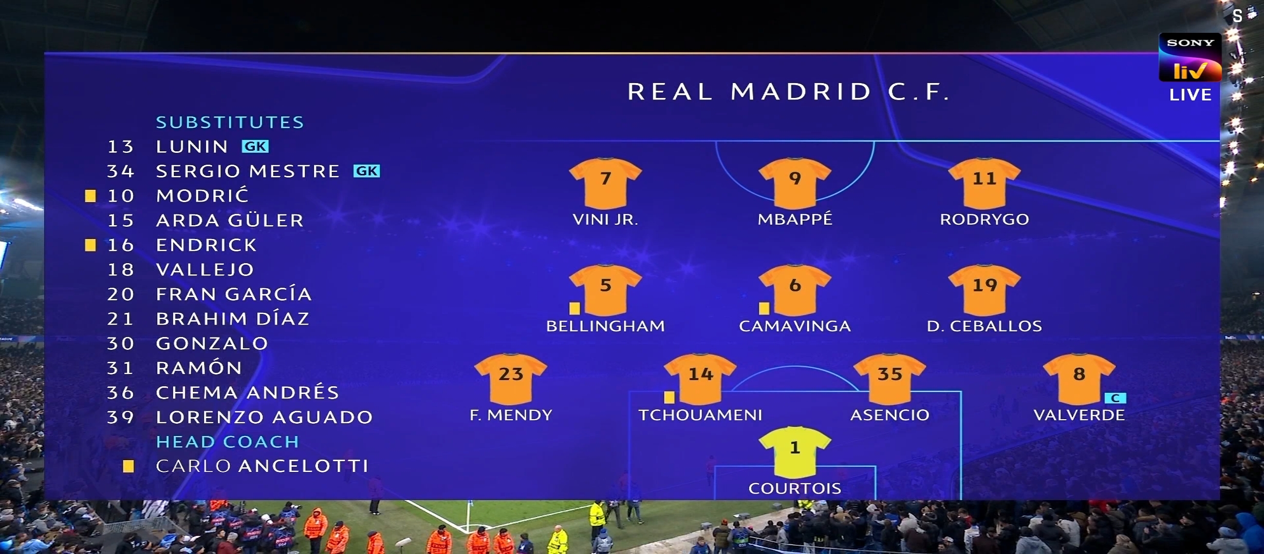 গতকাল ম্যানসিটি ফ্যান রা রীতিমতো ভিনিকে স্টেডিয়ামে একটা ব্যানার দিয়ে অপমান করে। যেখানে লেখা ছিল ব্যালন ডিঅর নিয়ে কান্নাকাটি বন্ধ করো। ভিনি তার উওর দিয়েছে ম্যাচসেরার পুরষ্কার জিতে। রিয়াল মাদ্রিদ ৪-৩-৩ ফর্মেশনে মাঠে নামে। অন্যদিকে সিটির ফর্মেশনে ছিল ৪-২-৩-১। খেলা শুরু হয়। ম্যাচের শুরু থেকে ঘরের মাঠে রিয়াল মাদ্রিদ কে চাপে রাখে ম্যানচেস্টার সিটি। বিশেষ করে প্রথমদিকে বল দখলে অনেক টা এগিয়ে ছিল ম্যান সিটি। ম্যাচের ১২ মিনিটের দিকে দারুণ একটা সুযোগ পাই রিয়াল মাদ্রিদ। তবে সুযোগ টা নষ্ট করে মেন্ডি। সহজ সুযোগ পেয়েও গোল দিতে পারে না। এরপর ভিনিসিয়াস নিজেও একটা সুযোগ মিস করি। যেটা গোল হওয়া উচিত ছিল। ম্যাচের ১৯ মিনিটে সিটির হয়ে গোল করে আর্লিং হ্যালান্ড। এই গোলে ম্যাচে ১-০ তে এগিয়ে যায় ম্যান সিটি।