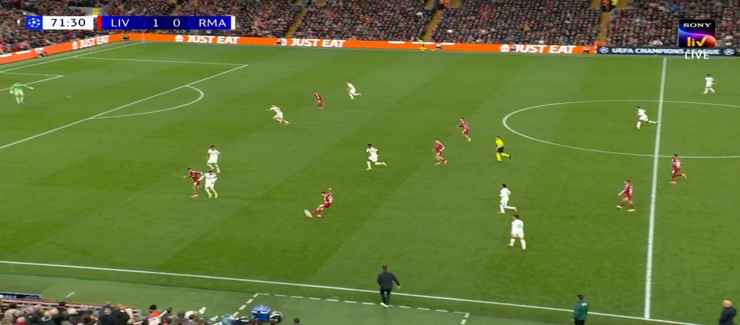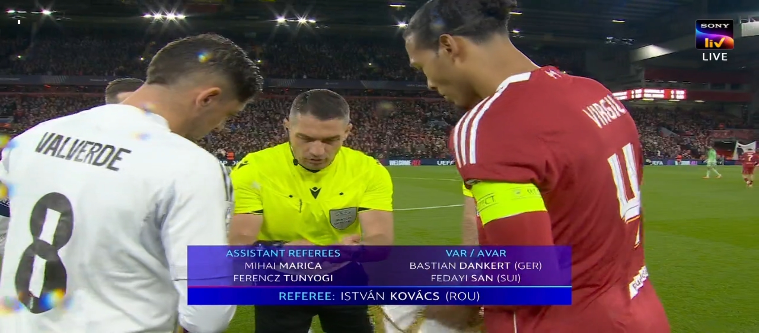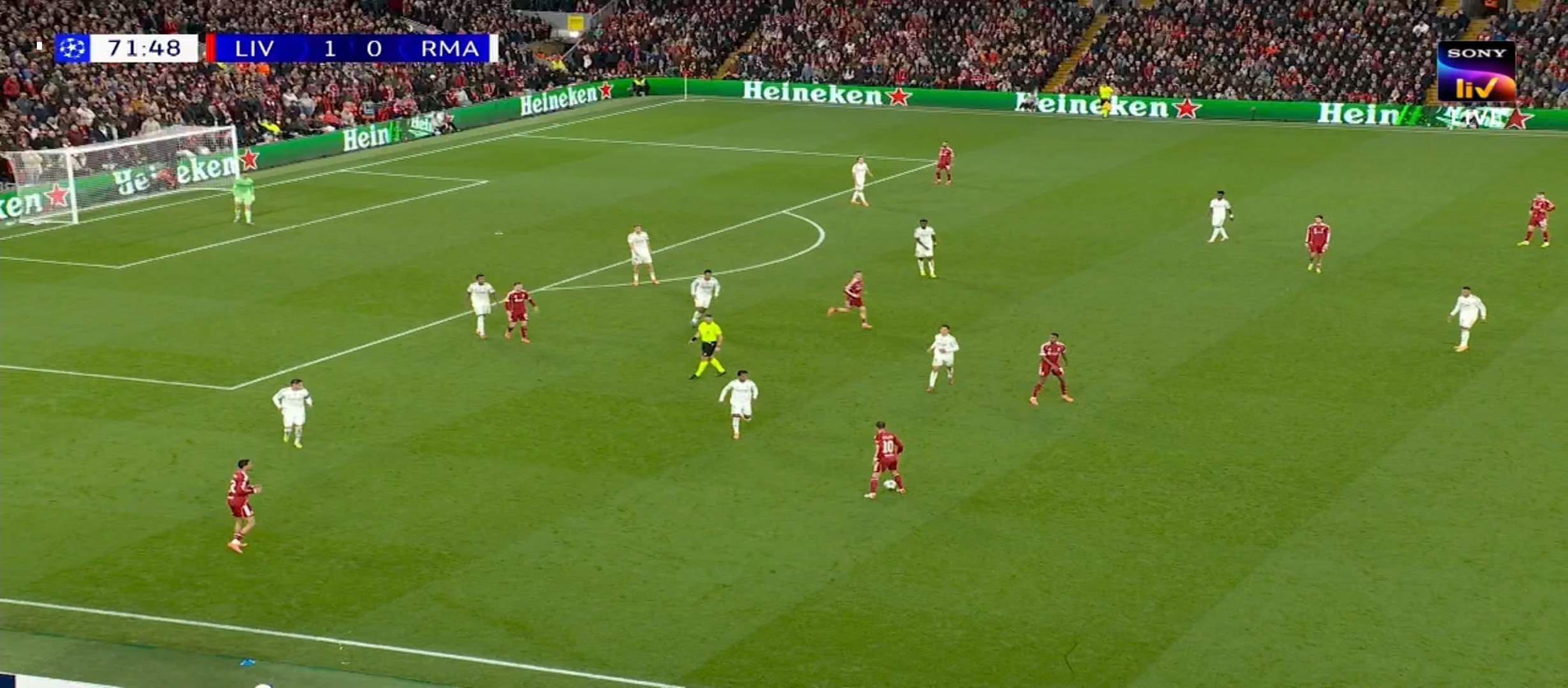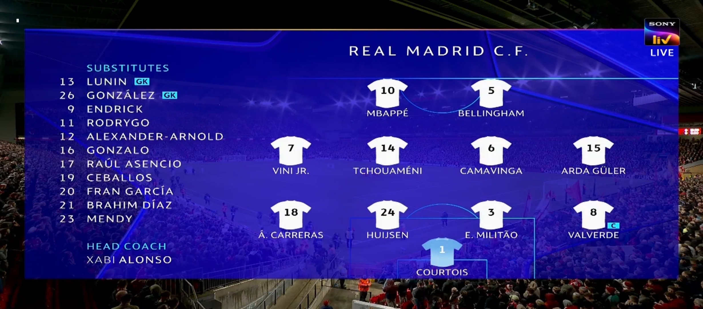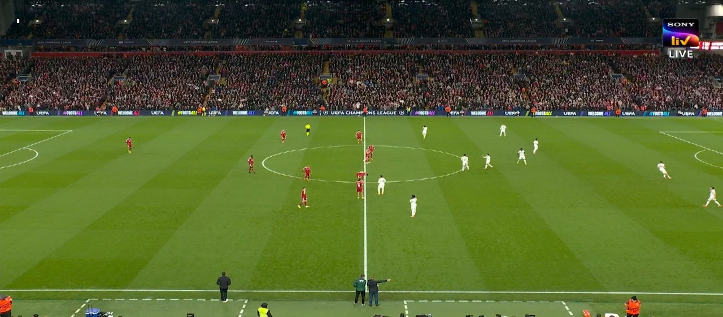 ঘরের মাঠে লিভারপুল পুরোপুরি ৪-৩-৩ ফর্মেশনে মাঠে নামে। যদিও এই বছর তারা লীগে খুব একটা ভালো অবস্থানে নেই। টানা কয়েকটা ম্যাচ তারা হেরে বসেছে। রিয়াল মাদ্রিদের ফর্মেশন ছিল ৪-৪-২। ইঞ্জুরি থেকে ফিরলেও আর্নল্ড স্টার্ট করেনি। তার পরিবর্তে রাইট ব্যাক পজিশনে শুরু করেছিল ভালভার্দে। আর্নল্ড এই বছরই রিয়াল মাদ্রিদে পাড়ি জমিয়েছে। এর আগে সে জীবনের ২২ টা বছর কাটিয়েছে এই লিভারপুলে। সেই লিভারপুল একাডেমি থেকে। খেলা শুরু হয় বাংলাদেশ সময় রাত ২ টার সময়। একটু বেশি রাতেই ছিল খেলাটা। খেলা শুরুর প্রথম কয়েক মিনিট লিভারপুল বেশ কয়েকটা আক্রমণ করে। কিন্তু সুবিধা করতে পারেনি। এরপর রিয়াল মাদ্রিদ বেশ খেলায় ফিরে আসে। বল নিজেদের দখলে রেখে আক্রমণে যাচ্ছিল।