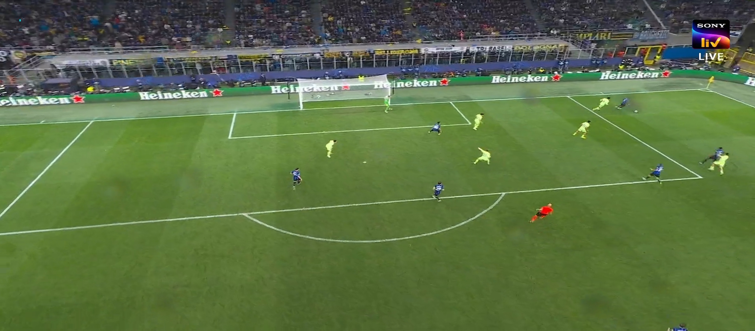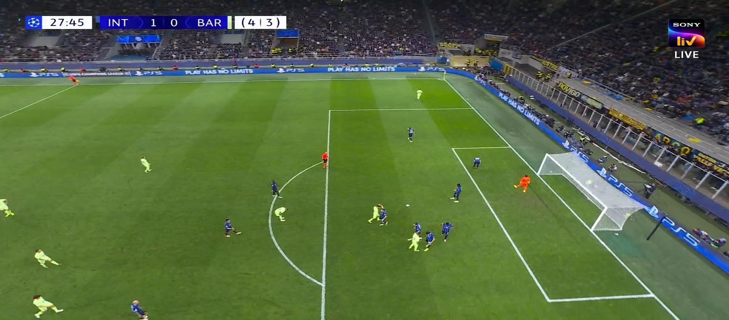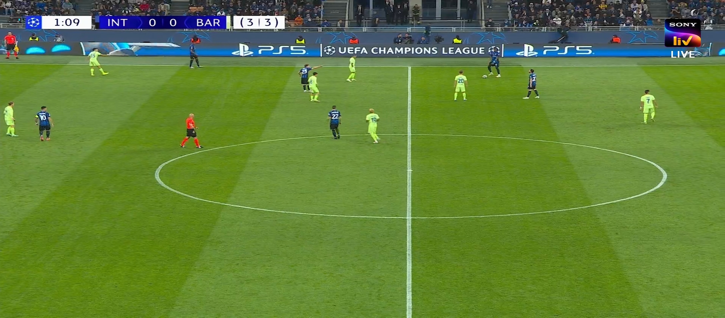 ম্যাচের প্রথম দিকে ইন্টার মিলান বেশ ভালো খেলছিল। অধিকাংশ বল নিজেদের দখলে রেখে আক্রমণ করছিল একটা চাপ সৃষ্টি করছিল। ম্যাচের ২১ মিনিটে লাউতারো মার্টিনেজ গোল করে এবং ইন্টার মিলানকে ১-০ এগিয়ে নিয়ে যায়। এর মাঝে বার্সেলোনা কিছু আক্রমণ করলেও কোন লাভ হয়নি। ম্যাচের ৪৪ মিনিটে ডিবক্সের মধ্যে লাউতারো কে গুরুতর ফাউল করলে পেনাল্টি পেয়ে যায় ইন্টার মিলান। পেনাল্টি থেকে দারুণ একট স্পট কিক নেয় চাহানুলু। এবং গোল করে ইন্টার মিলানকে ২-০ গোলে এগিয়ে নিয়ে যায়। দুই লেগ মিলিয়ে ম্যাচের ফলাফল তখন ৫-৩। প্রথমার্ধের বাকি সময়ে বেশ কিছু আক্রমণ বার্সেলোনা করেছিল কিন্তু কোন লাভ হয়নি। শেষ পযর্ন্ত গোল করতে পারেনি। শেষ হয় প্রথমার্ধের খেলা।