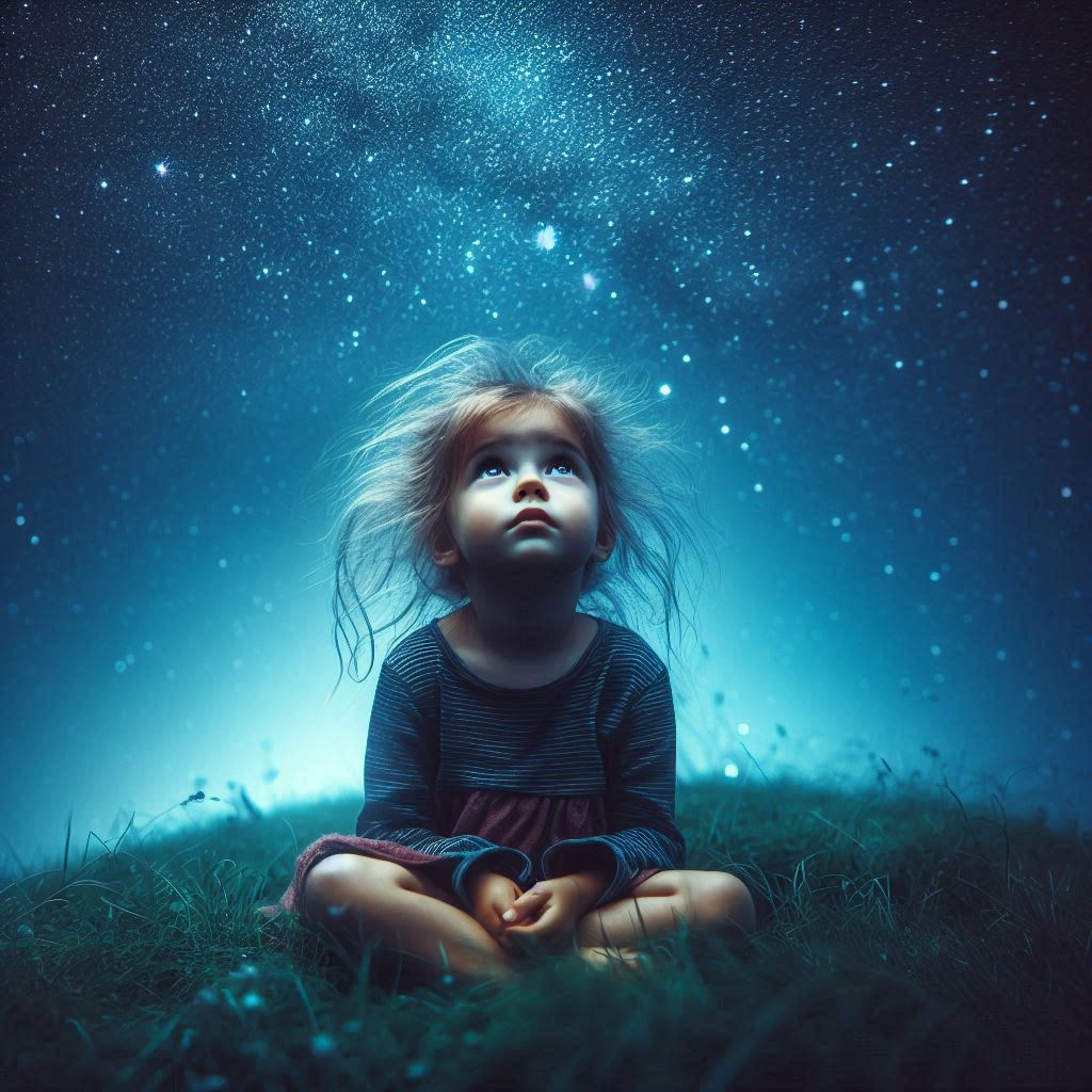 Ось така цікава відповідь... Дитина сидить у травичці та дивиться високо вгору на зірки.