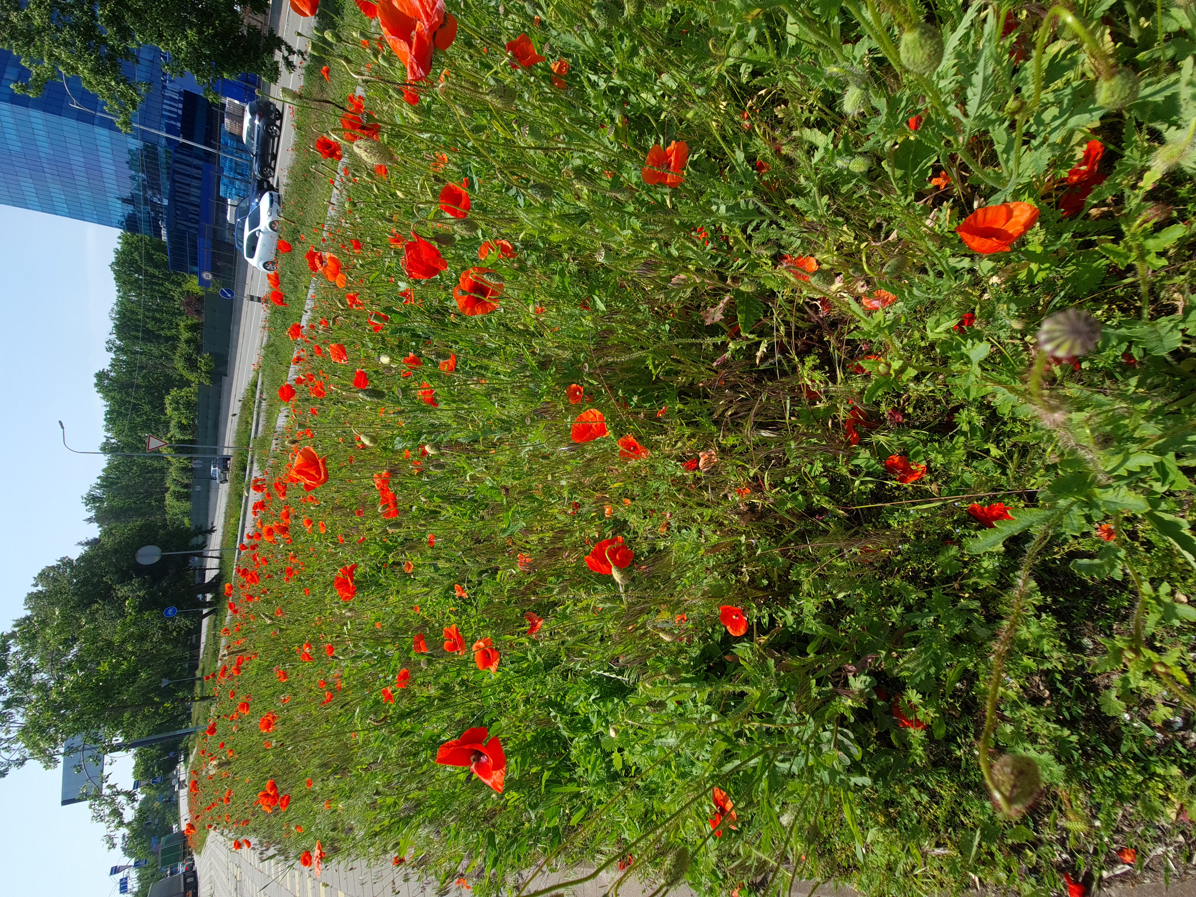 The bright red blooms add to the beauty of the city streets. I love the photo, it's so pretty🌹😊