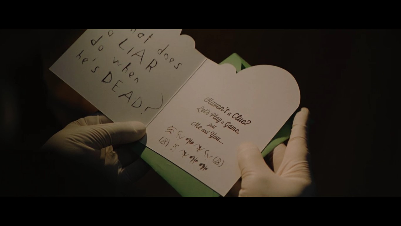 У листівці була загадка, яка повинна була допомогти розгадати шифр та вказати на наступний крок Загадника. За допомогою Альфреда Брюс розгадує цей ребус, який його приводить до гаража вбитого мера куди він прибуває разом з Гордоном. У середині одного з автомобілів вони знаходять флешку з відрубаним великим пальцем мера, який був прикріплений до носія пам'яті як брелок.