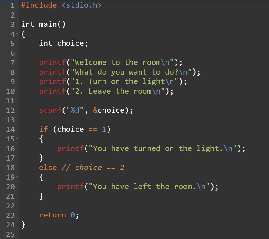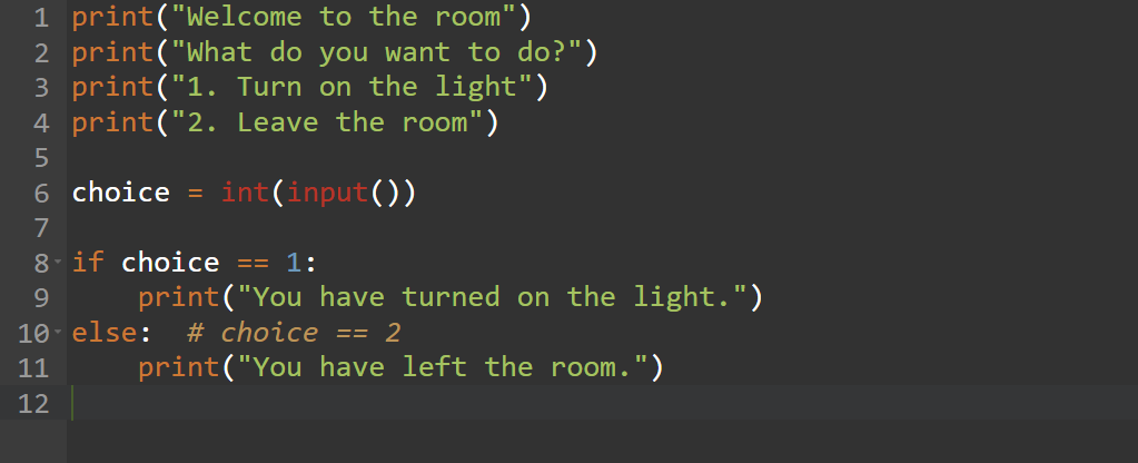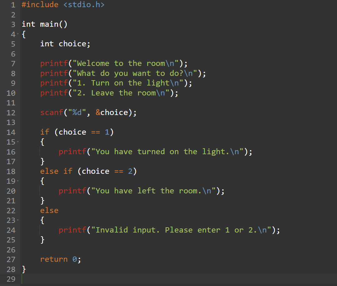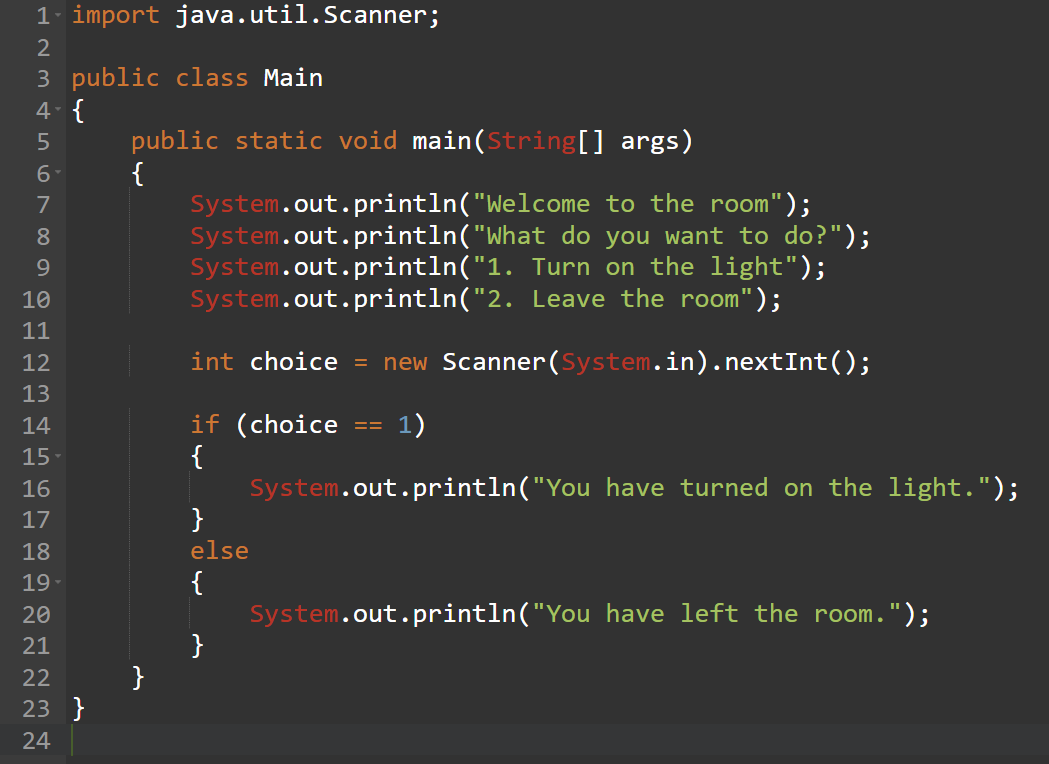 Створіть програму, яка повідомляє користувачеві «Ласкаво просимо до кімнати, що ви хочете зробити?», якщо користувач пише 1, відображається повідомлення «ви ввімкнули світло», якщо користувач пише 2, відображається повідомлення про те, що ви вийшли з кімнати. Використовуйте умовні способи.