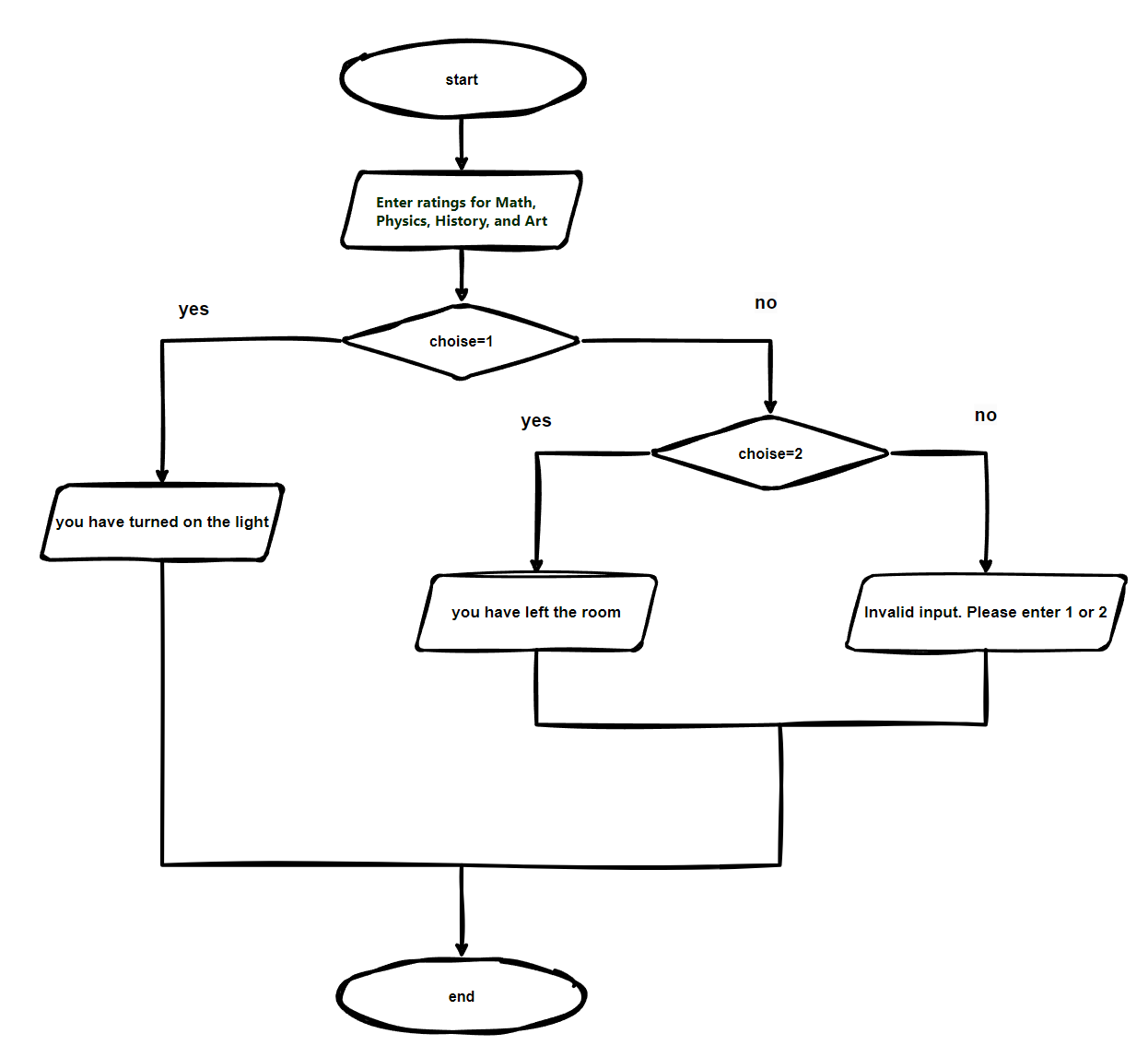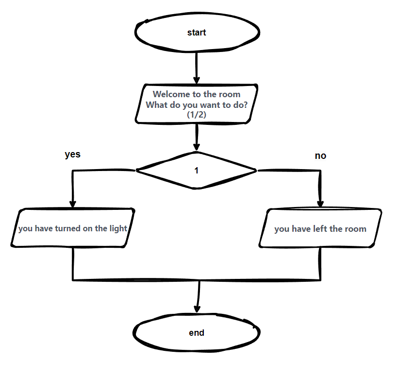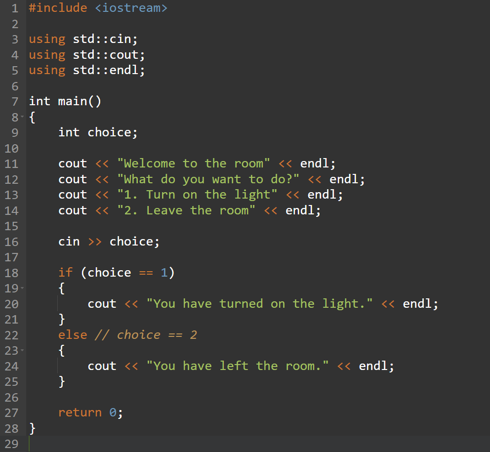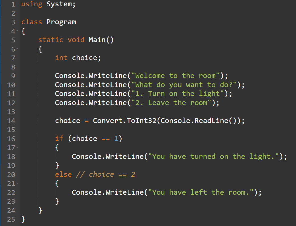 Створіть програму, яка повідомляє користувачеві «Ласкаво просимо до кімнати, що ви хочете зробити?», якщо користувач пише 1, відображається повідомлення «ви ввімкнули світло», якщо користувач пише 2, відображається повідомлення про те, що ви вийшли з кімнати. Використовуйте умовні способи.