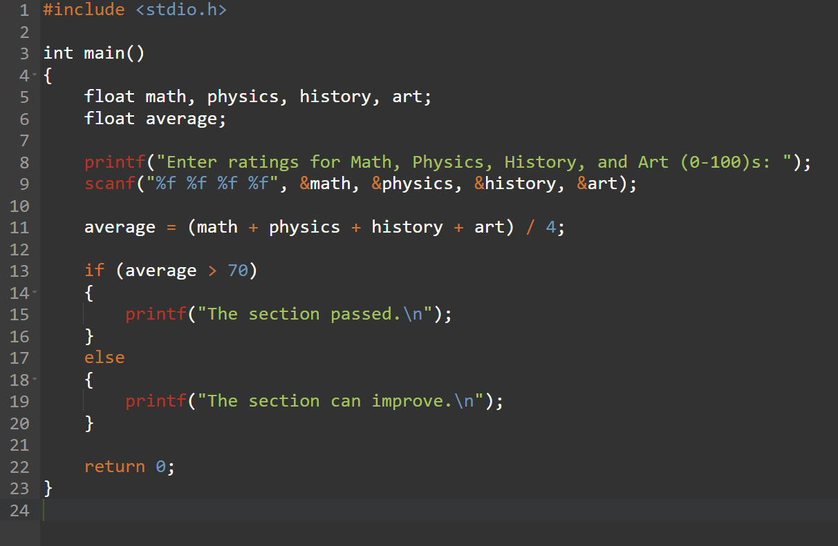 Створіть програму, яка запитує у користувача 4 різні оцінки, обчислює середнє значення, і якщо воно перевищує 70, відображається повідомлення про те, що розділ пройдено, якщо ні, відображається повідомлення про те, що розділ можна покращити.