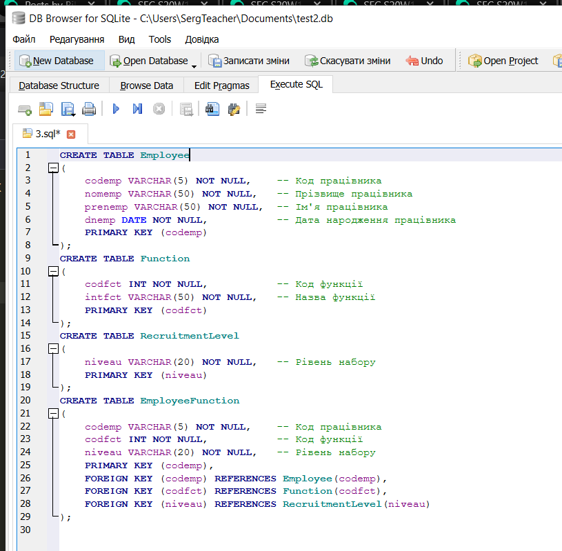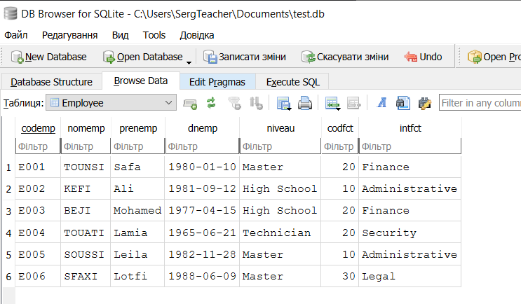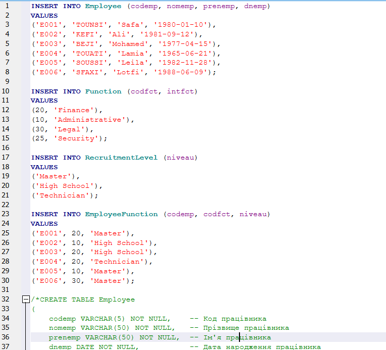 Для опису співробітників компанії та їх розподілу за різними функціями була створена наступна таблиця: