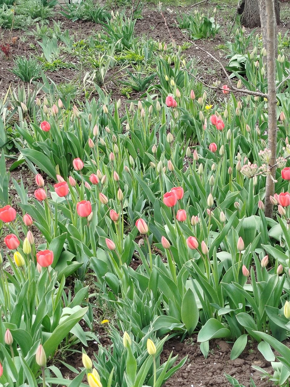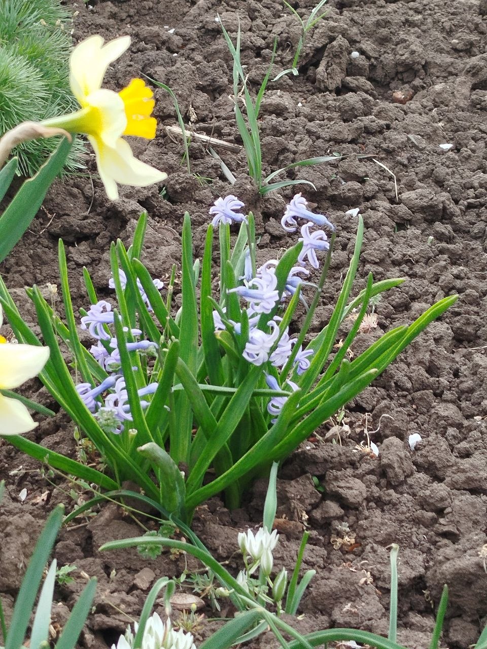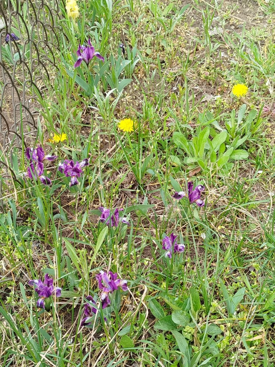 Then we finally reached the garden. The weather was gloomy, the sky was overcast, and a drizzle fell from time to time. But the flowers are still a joy to see: tulips, hyacinths, and daffodils are blooming everywhere. It’s incredibly beautiful! Our garden fence had tilted a bit, and we tried to fix it using some boards we found on abandoned plots, but we didn't succeed today. Oh well, we’ll clean it up another time.
