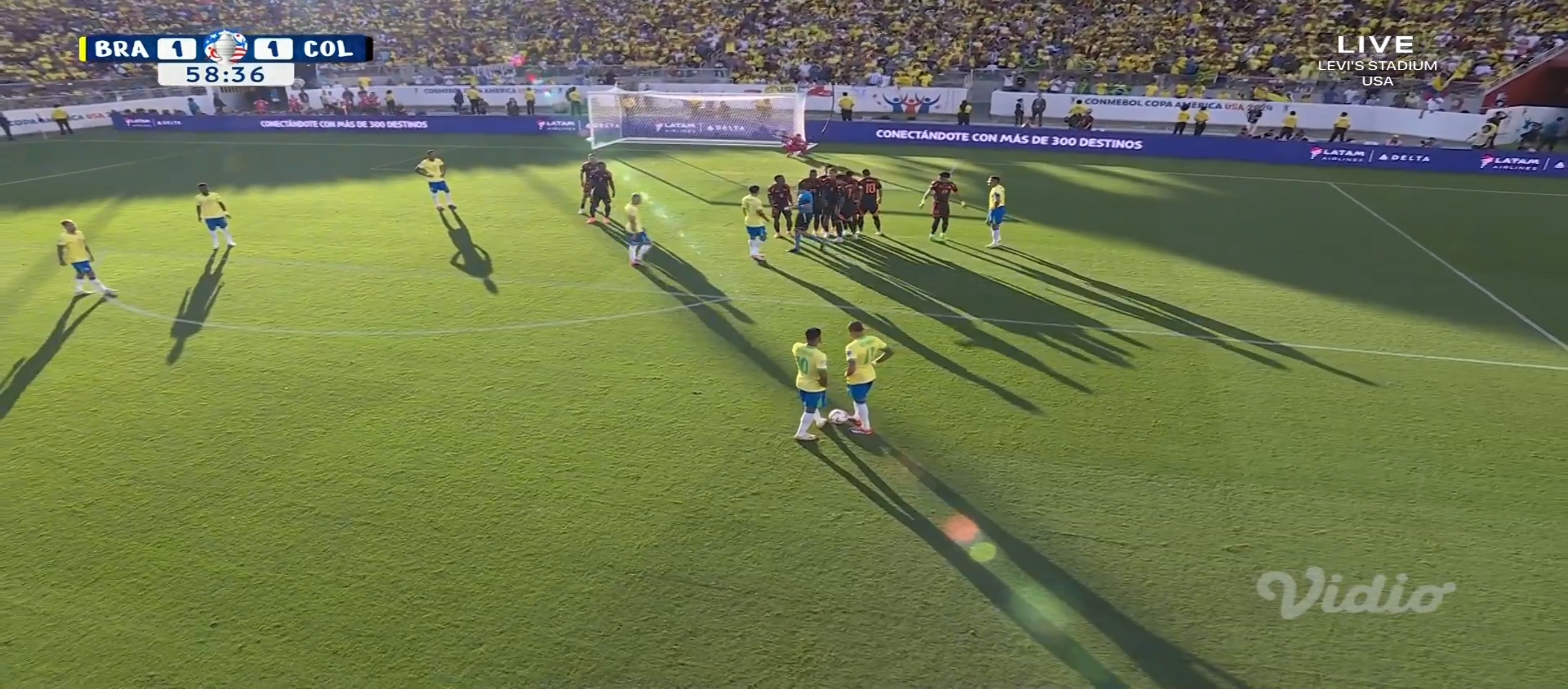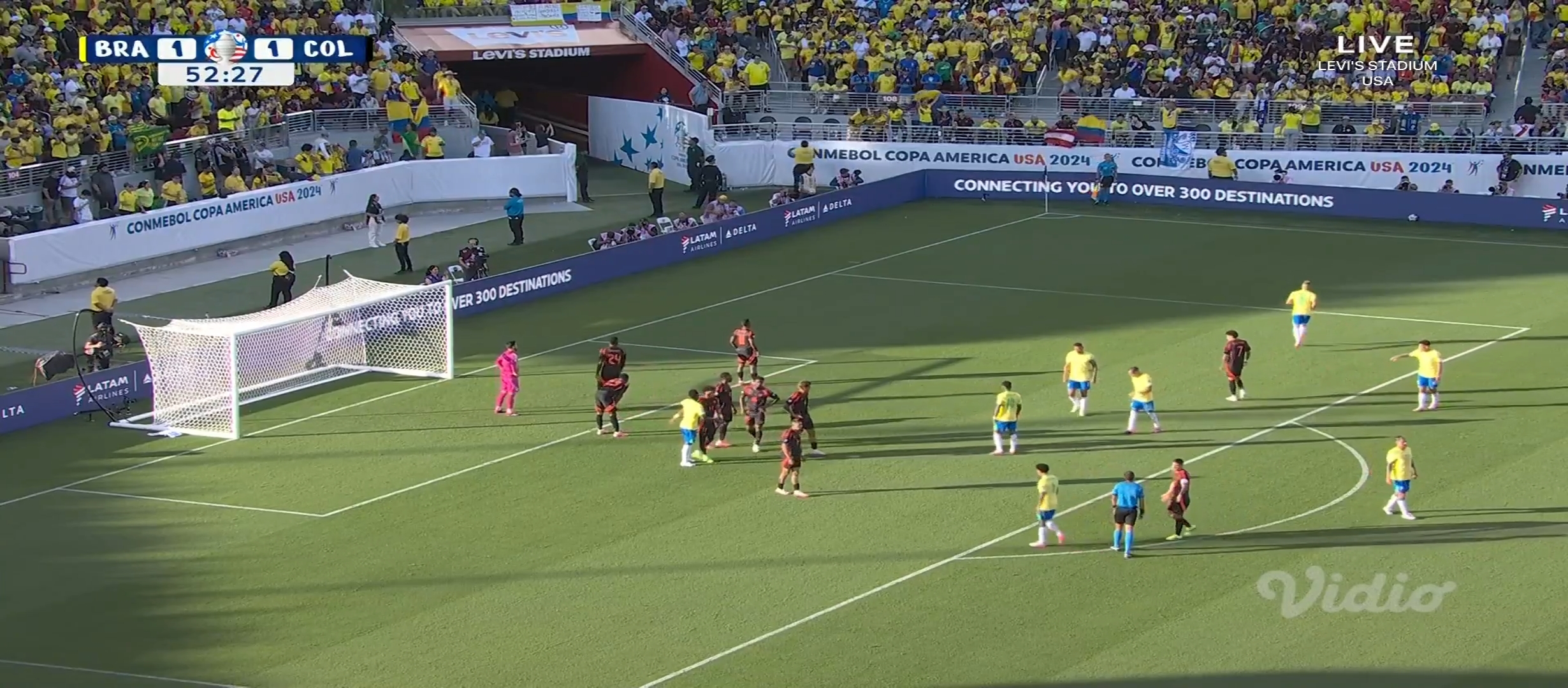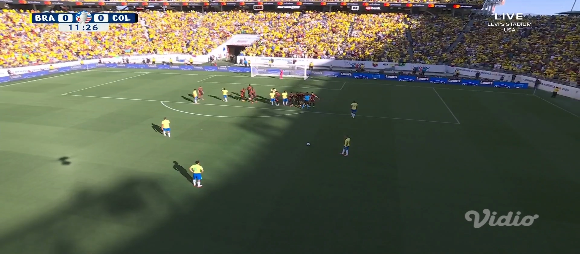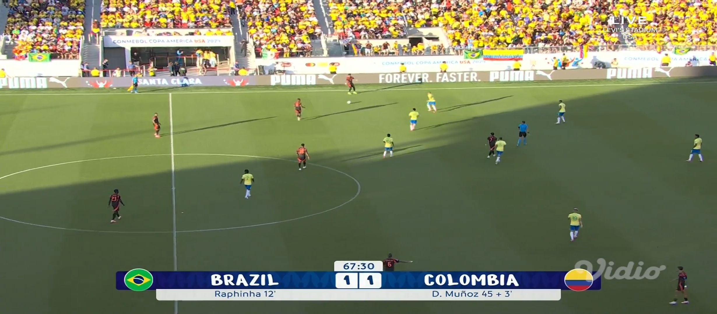 আশা করেছিলাম ব্রাজিল জয় নিয়ে মাঠ ছাড়বে। ব্রাজিল কোচ দরিভাল জুনিয়র তার দলকে মাঠে নামায় চিরচেনা ৪-৩-৩ ফর্মেশনে। অন্যদিকে কলম্বিয়ার ফর্মেশন ছিল ৪-৩-৩। ম্যাচটা ছিল সকাল সাত টাই। আমি ঘুম থেকে উঠেই ফ্রেশ না হয়েই ম্যাচটা দেখার জন্য বসে যায়। খেলা শুরু হয়। মোটামুটি কাঙ্ক্ষিত ভাবেই শুরু করে ব্রাজিল। প্রথম দিকে বেশ আক্রমণ করছিল। ম্যাচের ৭ মিনিটে একটা অনাকাঙ্খিত ফাউল করায় হলুদ কার্ড পায় ভিনিসিয়াস জুনিয়র। গ্রুপ পর্বে দুইটা হলুদ কার্ড পাওয়ায় সে মিস করবে পরবর্তী ম্যাচ। যাইহোক এরপর ম্যাচের ১২ মিনিটে ডি বক্সের বাইরে থেকে ফ্রী কিক পায় ব্রাজিল। এবং ফ্রী কিক থেকে গোল করে দলকে এগিয়ে নিয়ে যায় রাফিনহা।