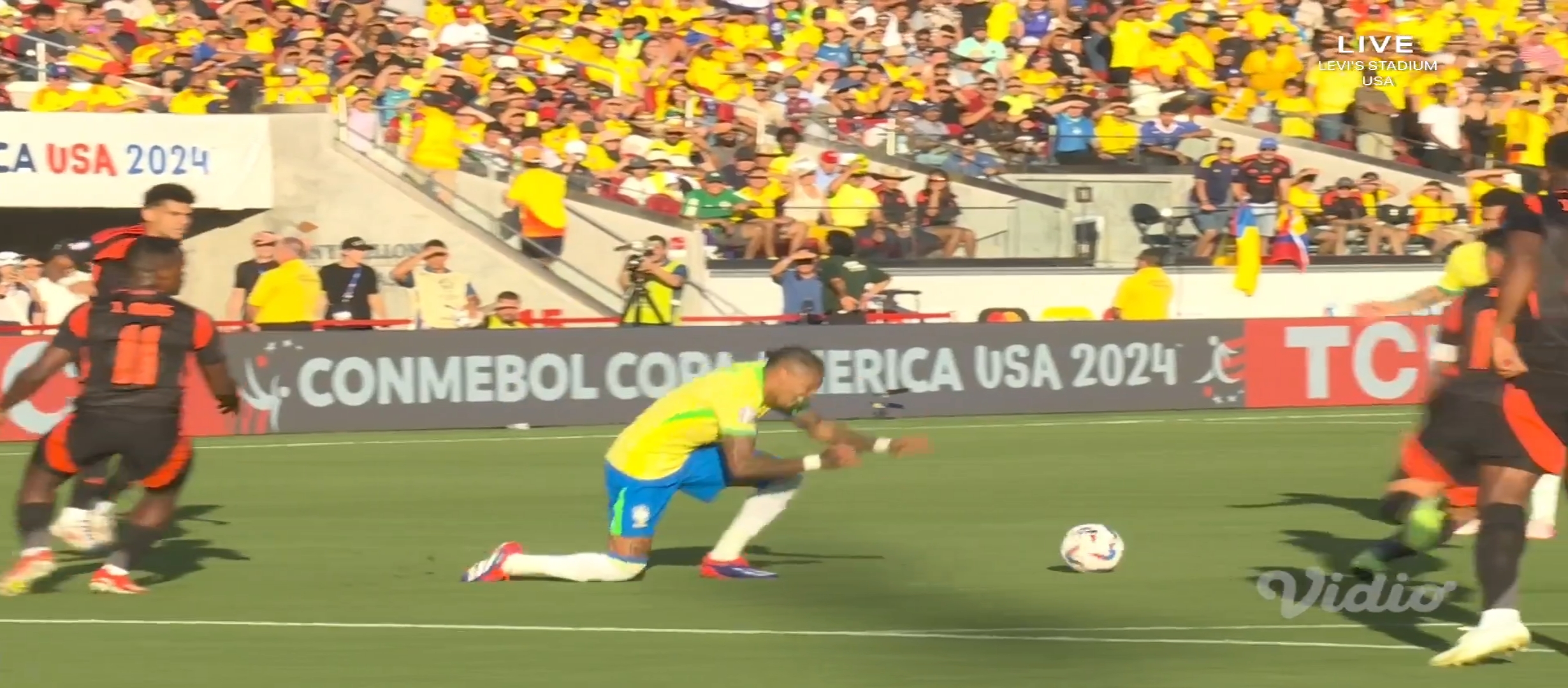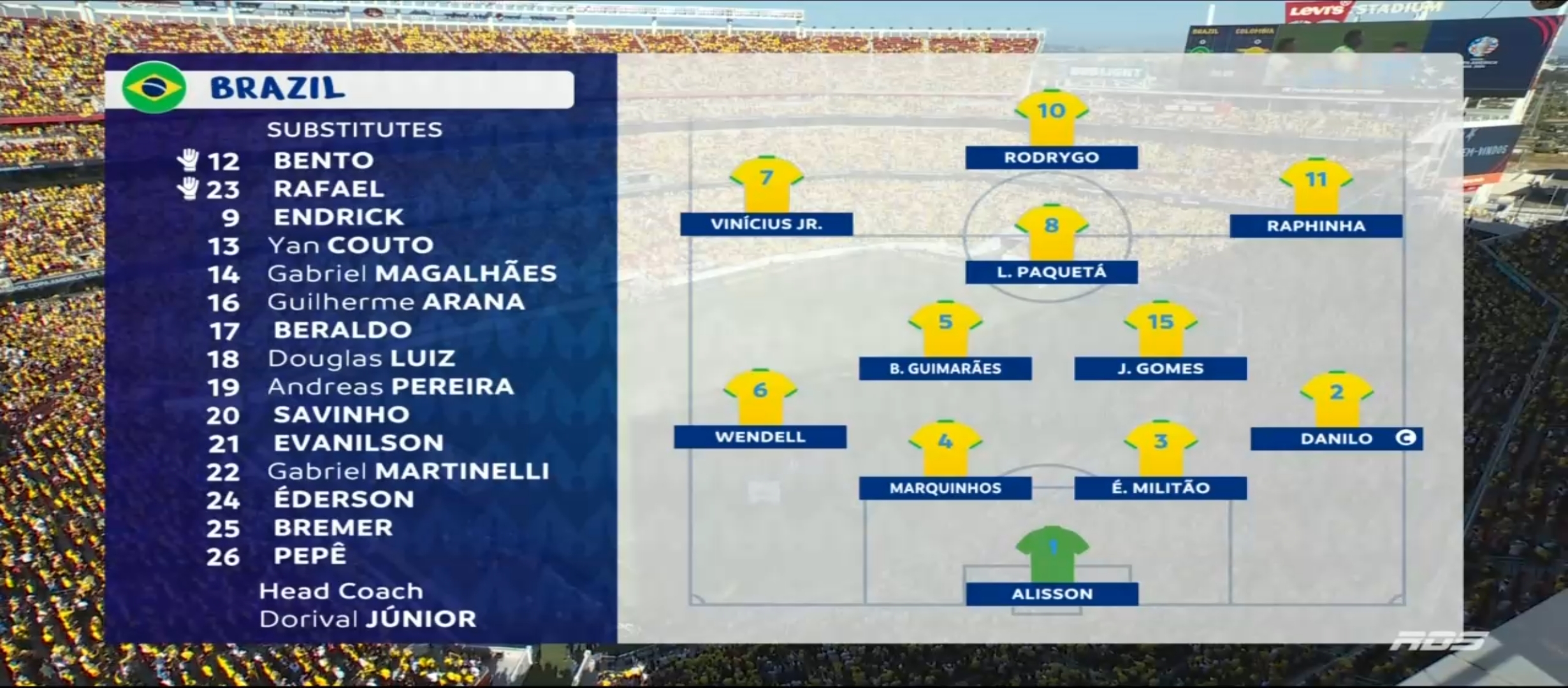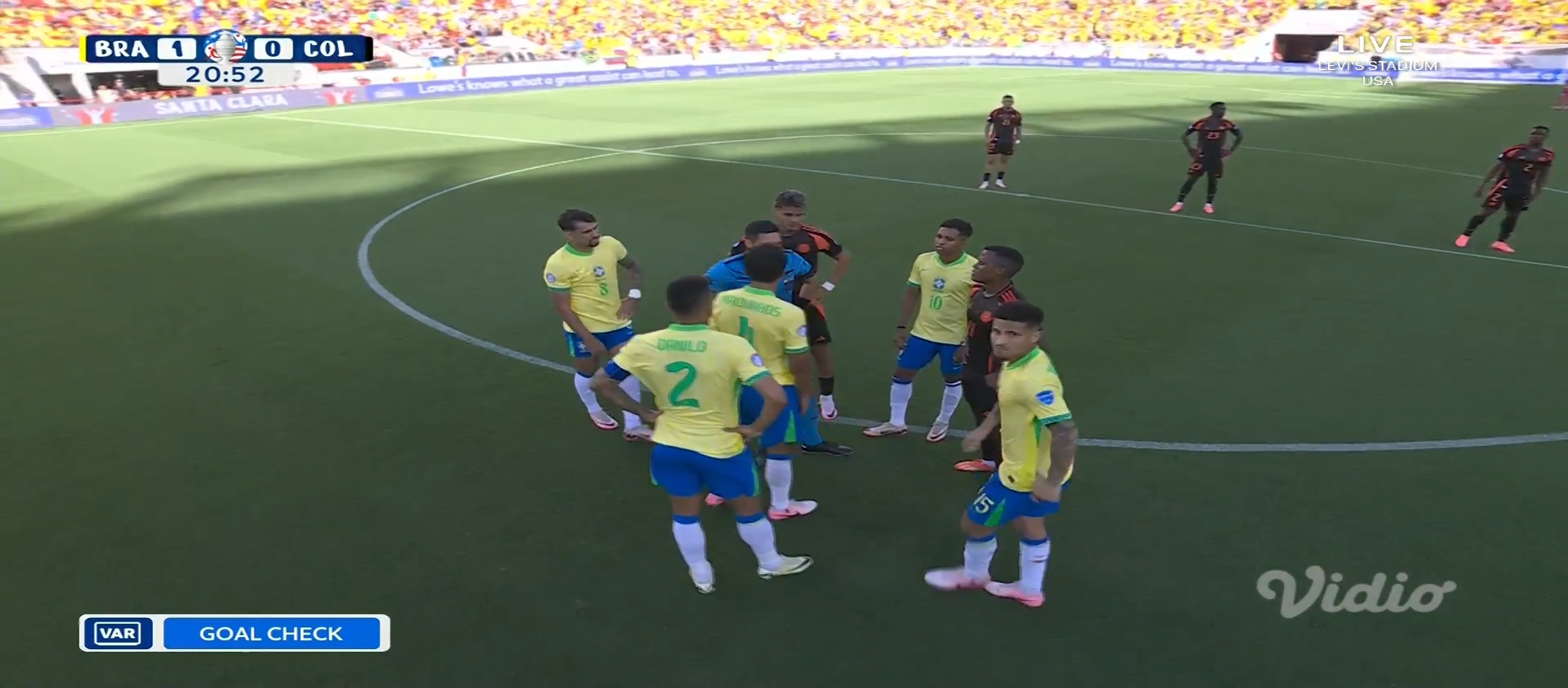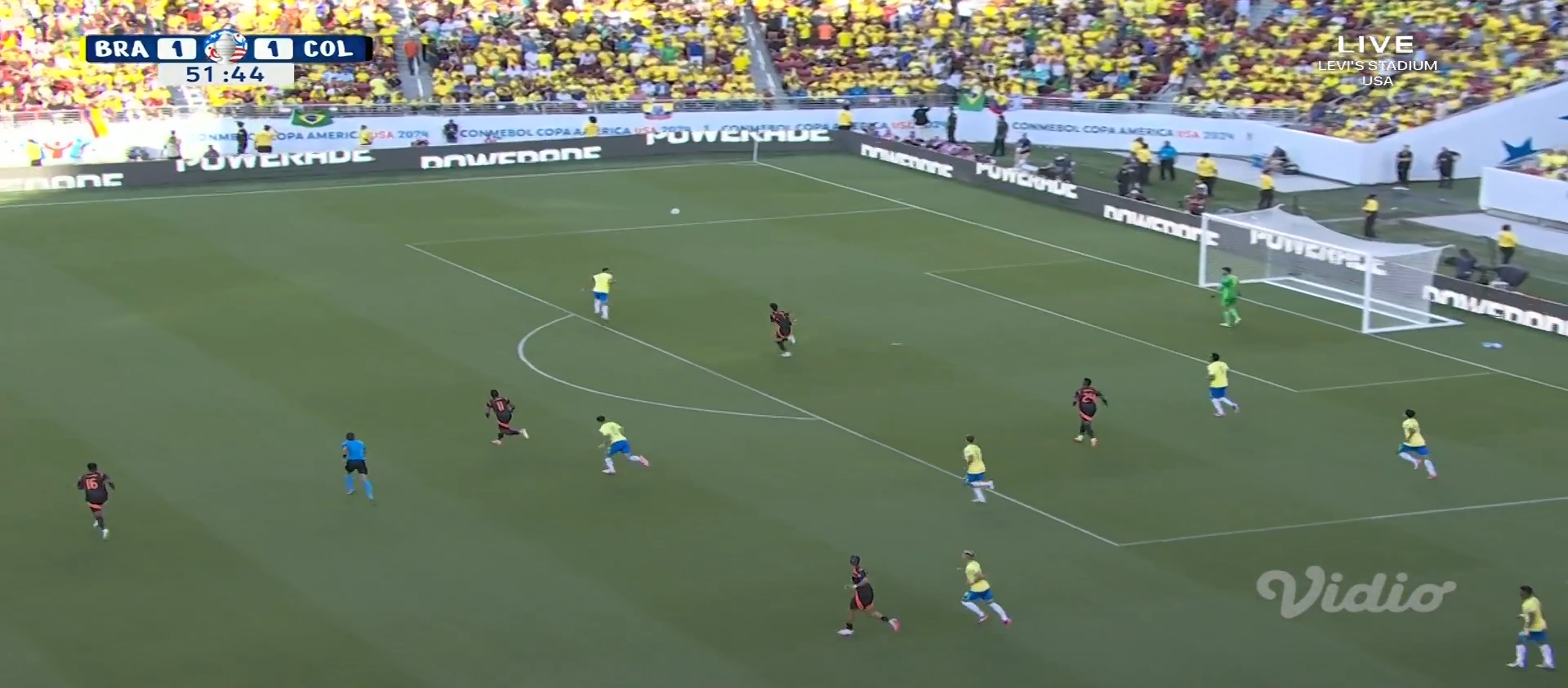 আশা করেছিলাম ব্রাজিল জয় নিয়ে মাঠ ছাড়বে। ব্রাজিল কোচ দরিভাল জুনিয়র তার দলকে মাঠে নামায় চিরচেনা ৪-৩-৩ ফর্মেশনে। অন্যদিকে কলম্বিয়ার ফর্মেশন ছিল ৪-৩-৩। ম্যাচটা ছিল সকাল সাত টাই। আমি ঘুম থেকে উঠেই ফ্রেশ না হয়েই ম্যাচটা দেখার জন্য বসে যায়। খেলা শুরু হয়। মোটামুটি কাঙ্ক্ষিত ভাবেই শুরু করে ব্রাজিল। প্রথম দিকে বেশ আক্রমণ করছিল। ম্যাচের ৭ মিনিটে একটা অনাকাঙ্খিত ফাউল করায় হলুদ কার্ড পায় ভিনিসিয়াস জুনিয়র। গ্রুপ পর্বে দুইটা হলুদ কার্ড পাওয়ায় সে মিস করবে পরবর্তী ম্যাচ। যাইহোক এরপর ম্যাচের ১২ মিনিটে ডি বক্সের বাইরে থেকে ফ্রী কিক পায় ব্রাজিল। এবং ফ্রী কিক থেকে গোল করে দলকে এগিয়ে নিয়ে যায় রাফিনহা।