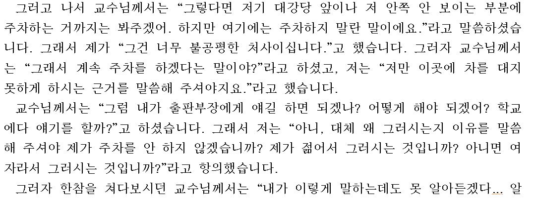"네? 무슨 말씀이세요? '교직원용'이라고 돼 있고 저희 출판부 직원 모두 여기다 차를 대고 있는데, 저만 여기 대지 말라는 말씀인가요?"