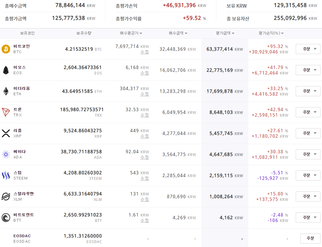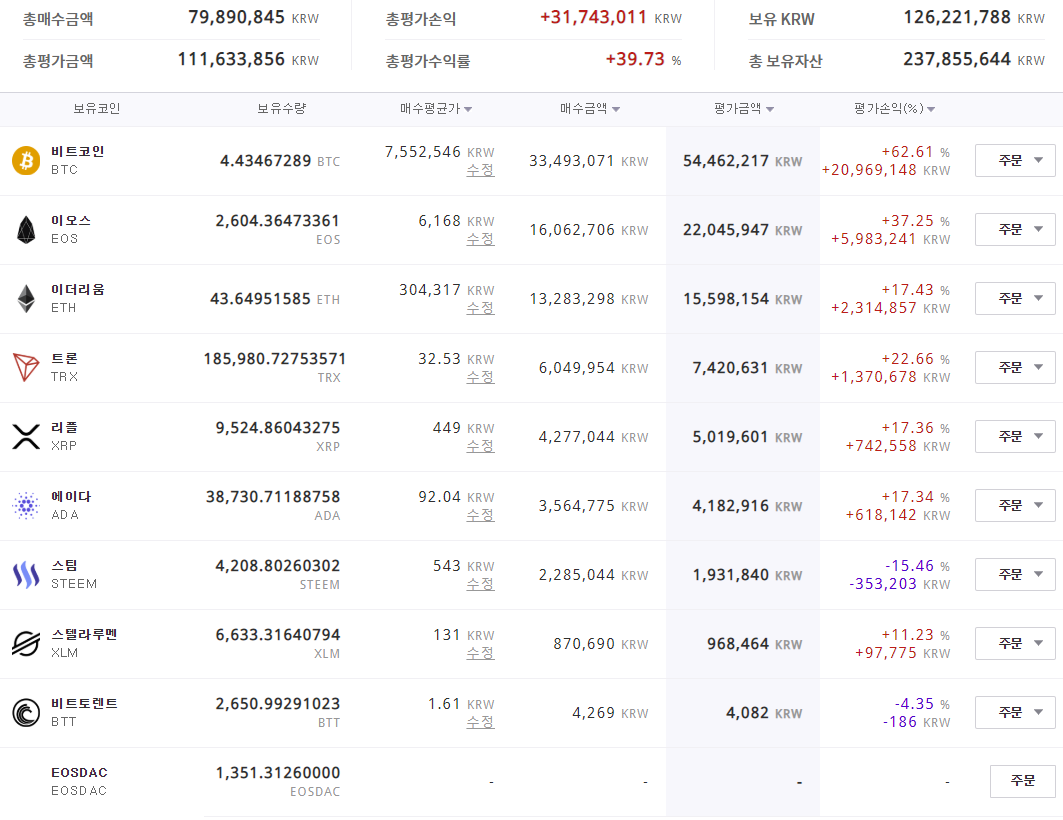 (암호화폐) 오늘의 수익율 - 내가 매도하면 날라가는구나?antny (32)in #upbit • 7 years ago (edited)아우... 불안해서 분할매도 했더니 날라가네... 조정하지도 않고 훨훨... 뭐냐... [ '19.6.22일 기준 ] [ '19.6.26일 기준 ] [ 코인 가격 ] 추가매도 시작... 현금은 1.29억에서 1.56억으로 증가. 비트코인은 1,530만원 수준... #bitcoin #cryptocurrency