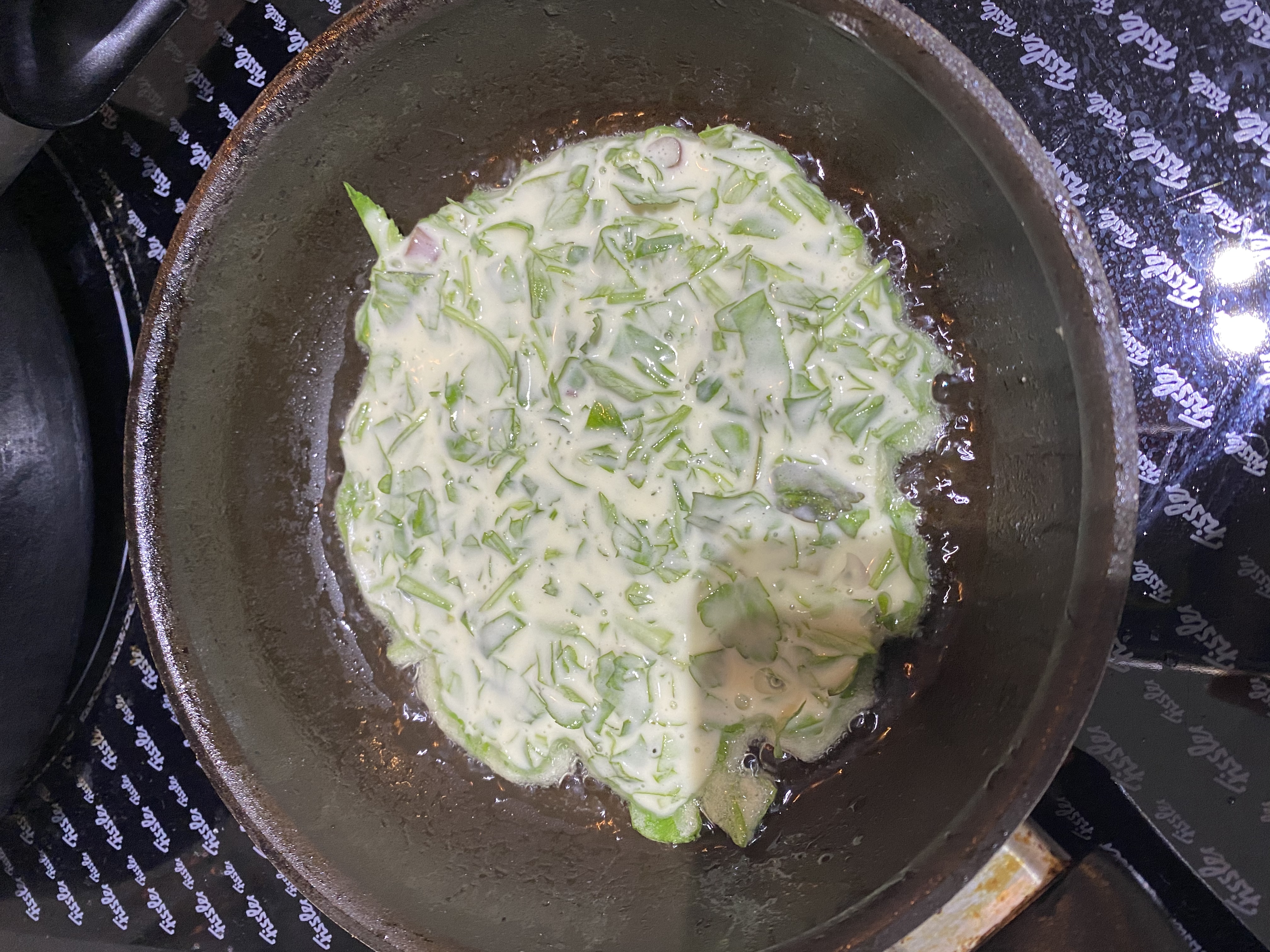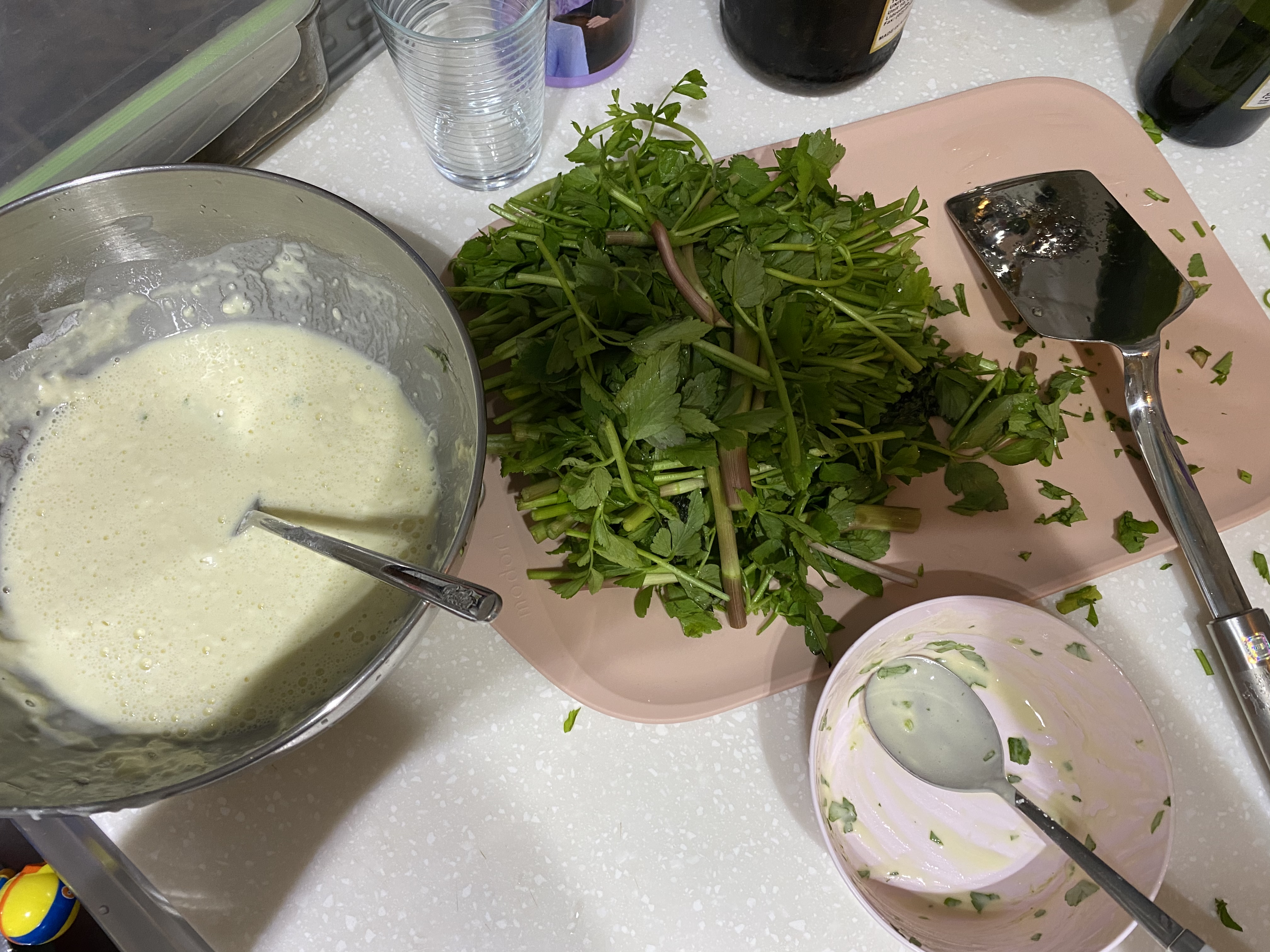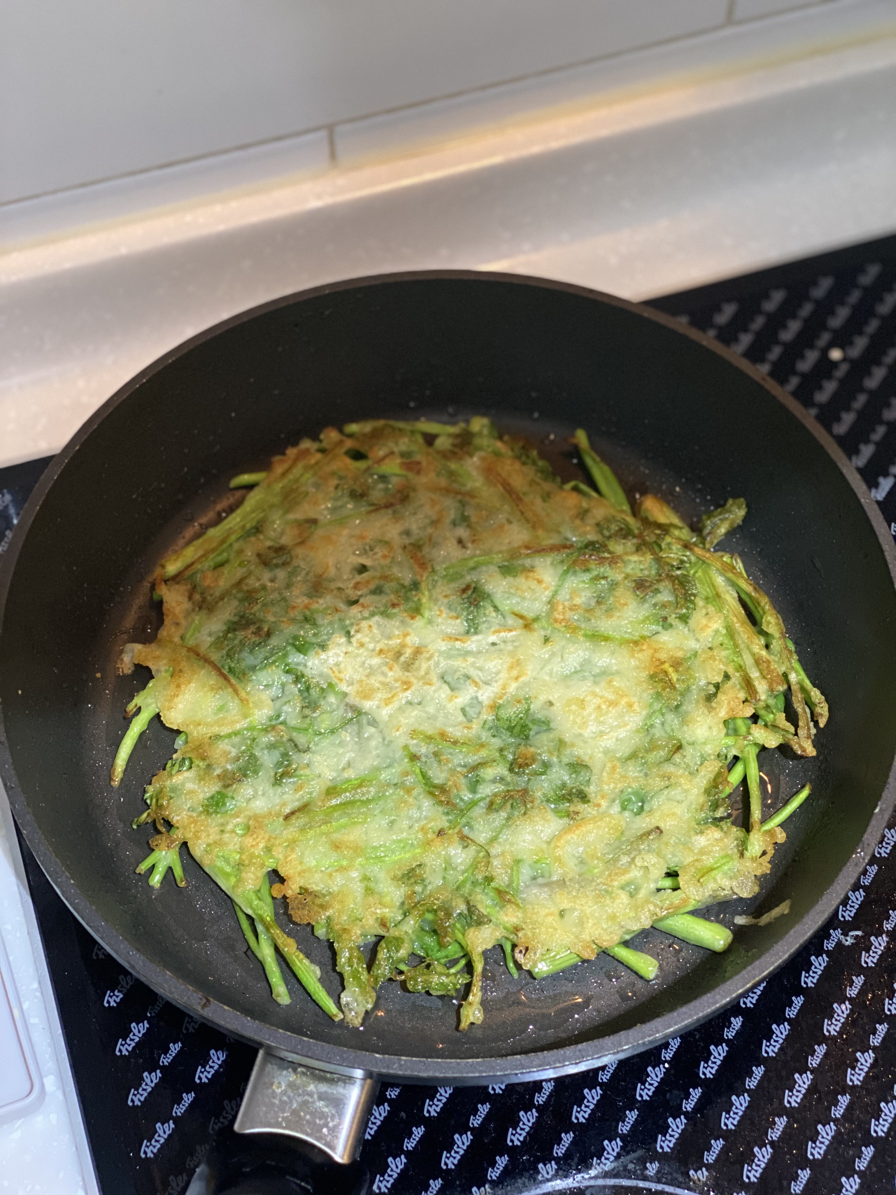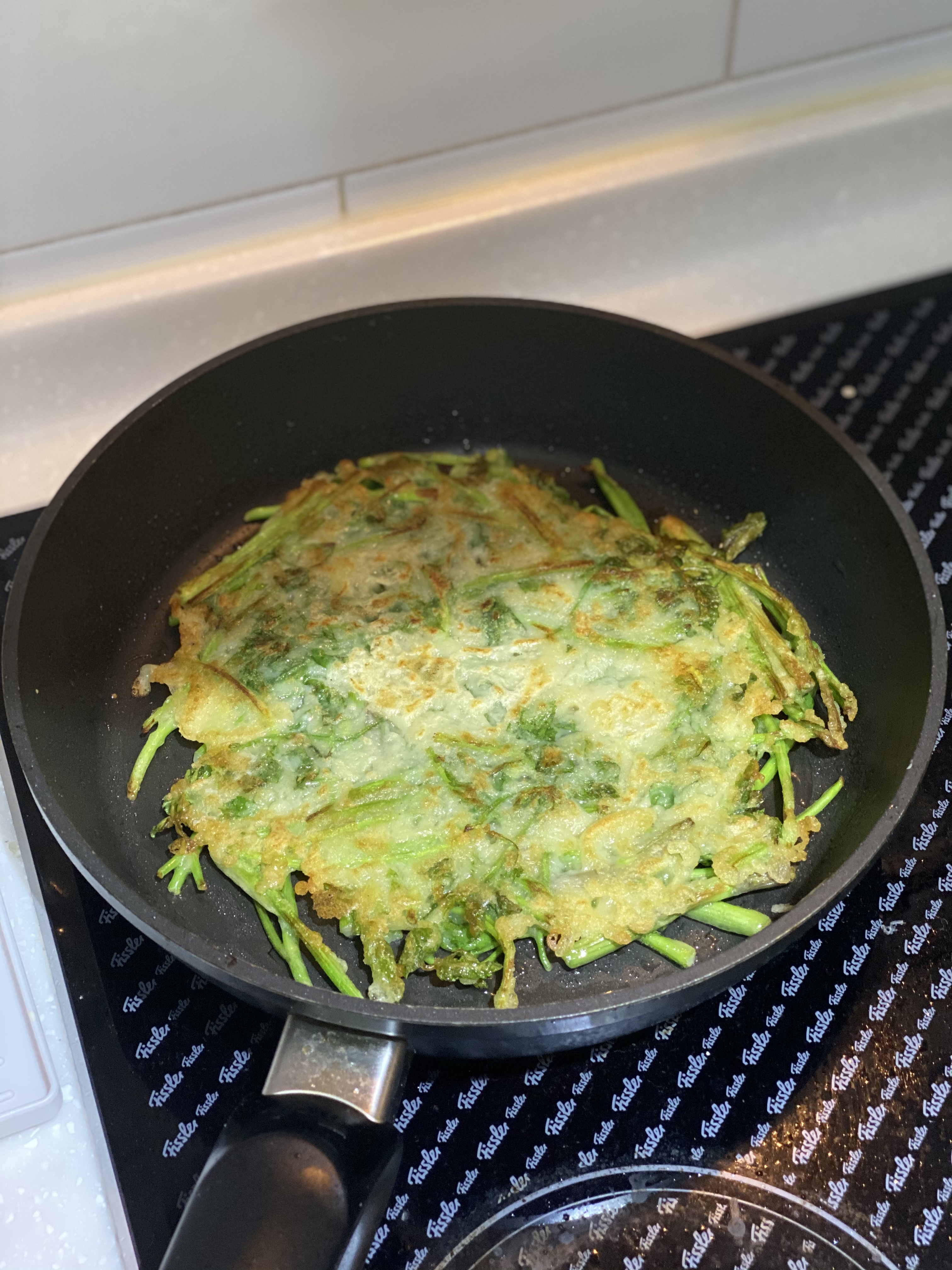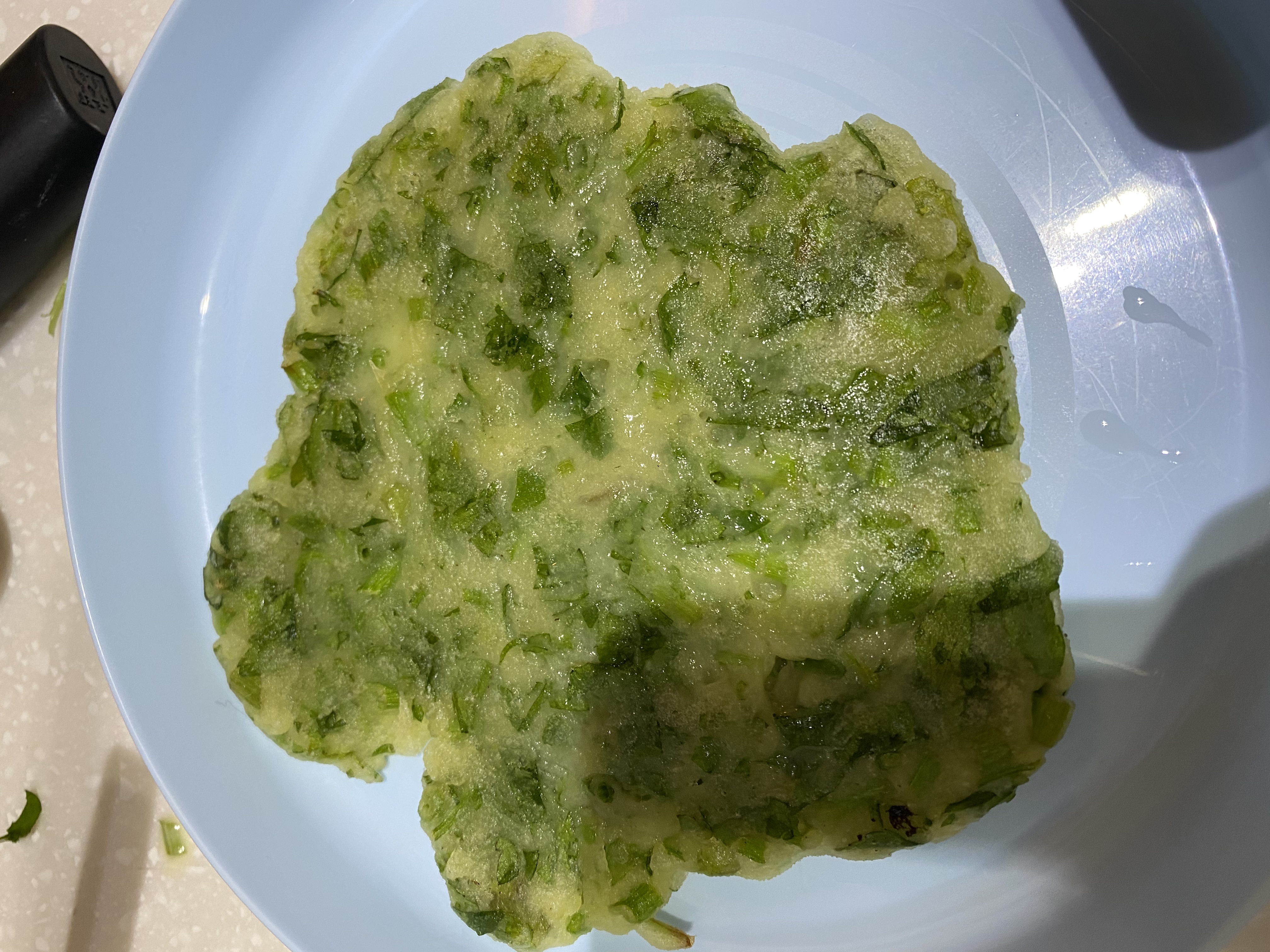 어른용은 좀 크게 썰고 젓갈 소스로 양념하고 부쳤는데요.. 담번엔 미나리를 조금만 더 잘게 썰면 좋겠다는..