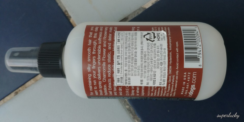 정전기방지를 해주어서 털뭉침을 손상없이 풀어주고, 오염물질이 털에 붙는것을 막아주어서 목욕전에 뿌려주면 이물질이 더 잘 빠지는 효과가 있습니다.