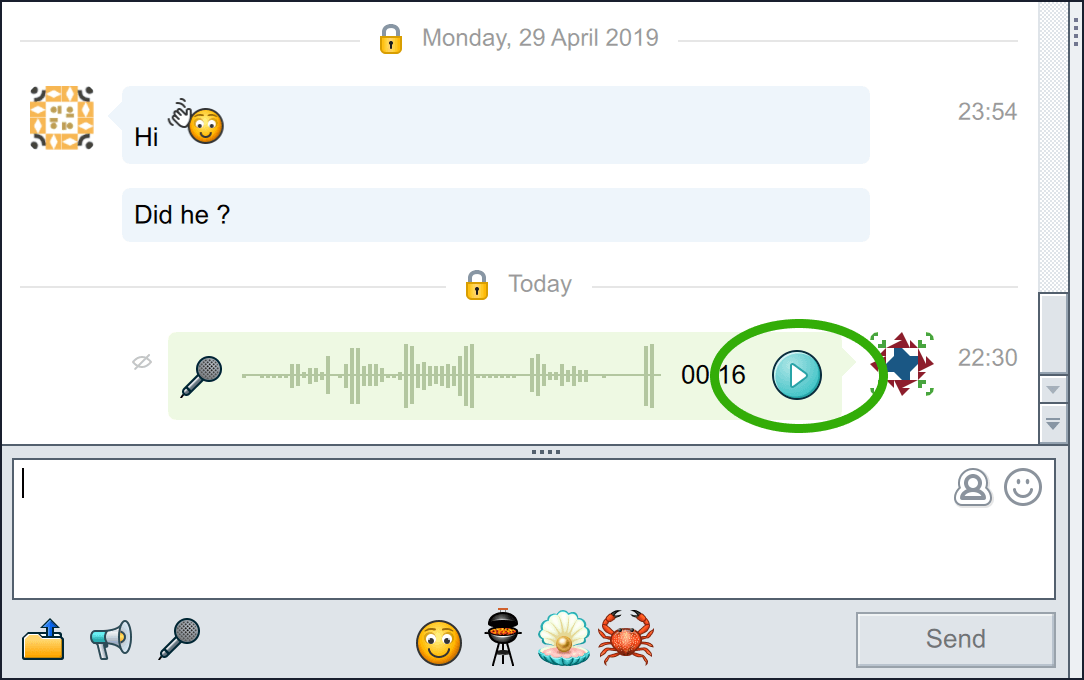 To listen to Voice messages click on "Play" button at the chat window. Press "Stop" to stop listening to the voice message.