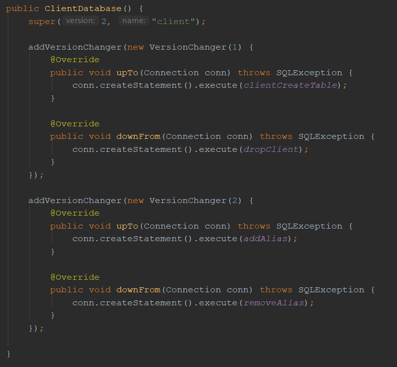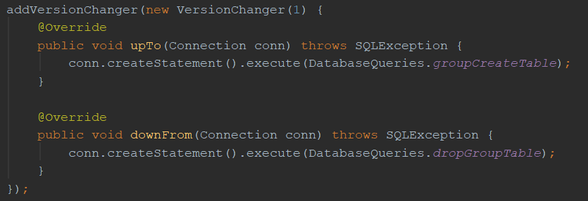 VersionChanger contains 2 methods that have to be implemented, upTo method will upgrade the table to specified version, downFrom method will downgrade from specified version to previous one. In the upTo and downFrom methods jdbc connection is passed using the parameter which can be used to create statements to execute query in the sqlite database.