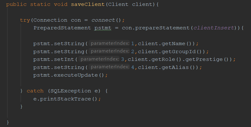 For the bot to comunicate with the database, to insert/select/delete from database static methods are using in Supbot API, in the method a connection has to be created with the Supbot SQlite database file using the connect() method (connect method is a method of Supbot not JDBC that is defined inside Database class). Then by using prepareStatement() queries can be created and executeQuery() to executue them.