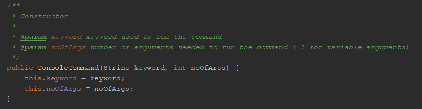 ConsoleCommandtakes 2 parameters,keywordandnoOfArgs. keywordis the string which is used to run the command.noOfArgsis the number of arguments required to use the command, you can keep this value-1in order to skip number of argument check for variable number of arguments.