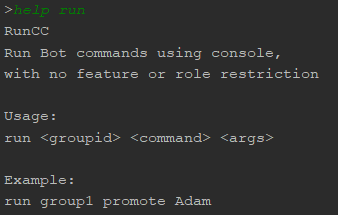 runcommand is used to run feature commands, which is used by the clients in whatsapp, using console commands.Using run command, Supbot creates a temporary client which has the highest privileges that is