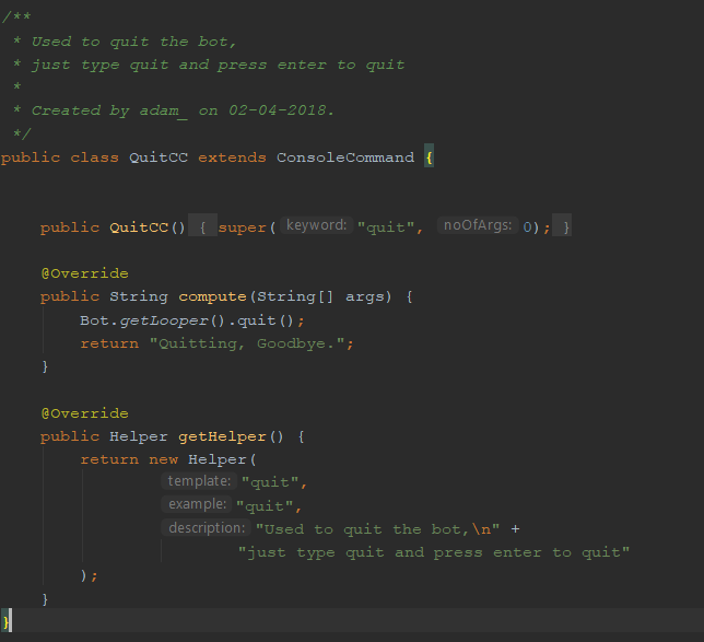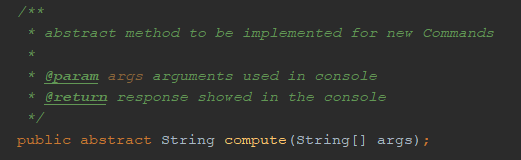 compute(String[] args)method is the method which is executed when the command is entered in the console.- It contains one parameter, called