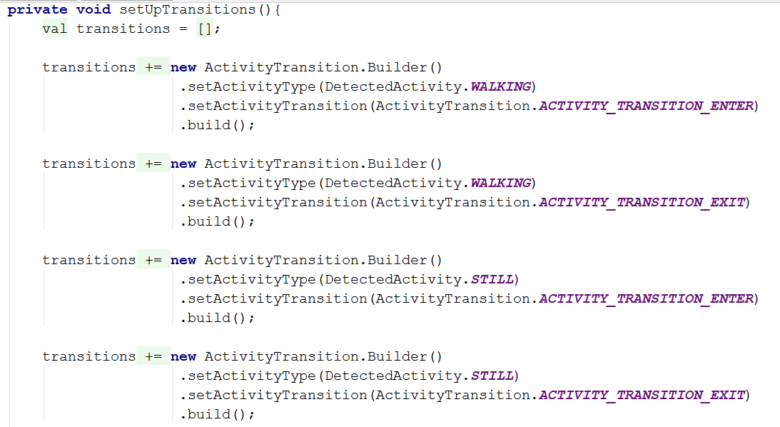 Here is a screenshot of how i created a list of ActivityTransitionObjects in my Transitions Android App