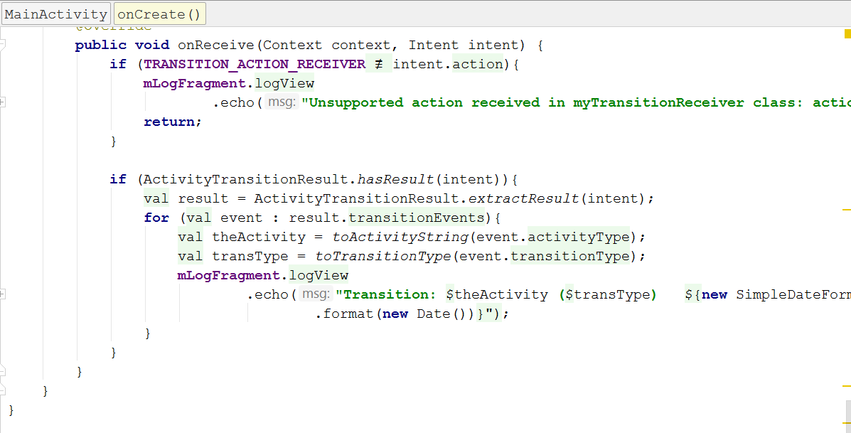 On the occurrence of the activity transition, an intent callback is received. An ActivityTransitionResult object can be extracted from the intent and this will include a list of ActivityTransitionEvent objects. The events are ordered in a timely manner. For instance, if an app makes a request for the IN_VEHICLE activity type on the ACTIVITY_TRANSITION_ENTER and ACTIVITY_TRANSITION_EXIT transitions, then an ActivityTransitionEvent is received when the user starts driving, and another when the user transits to any other activity.