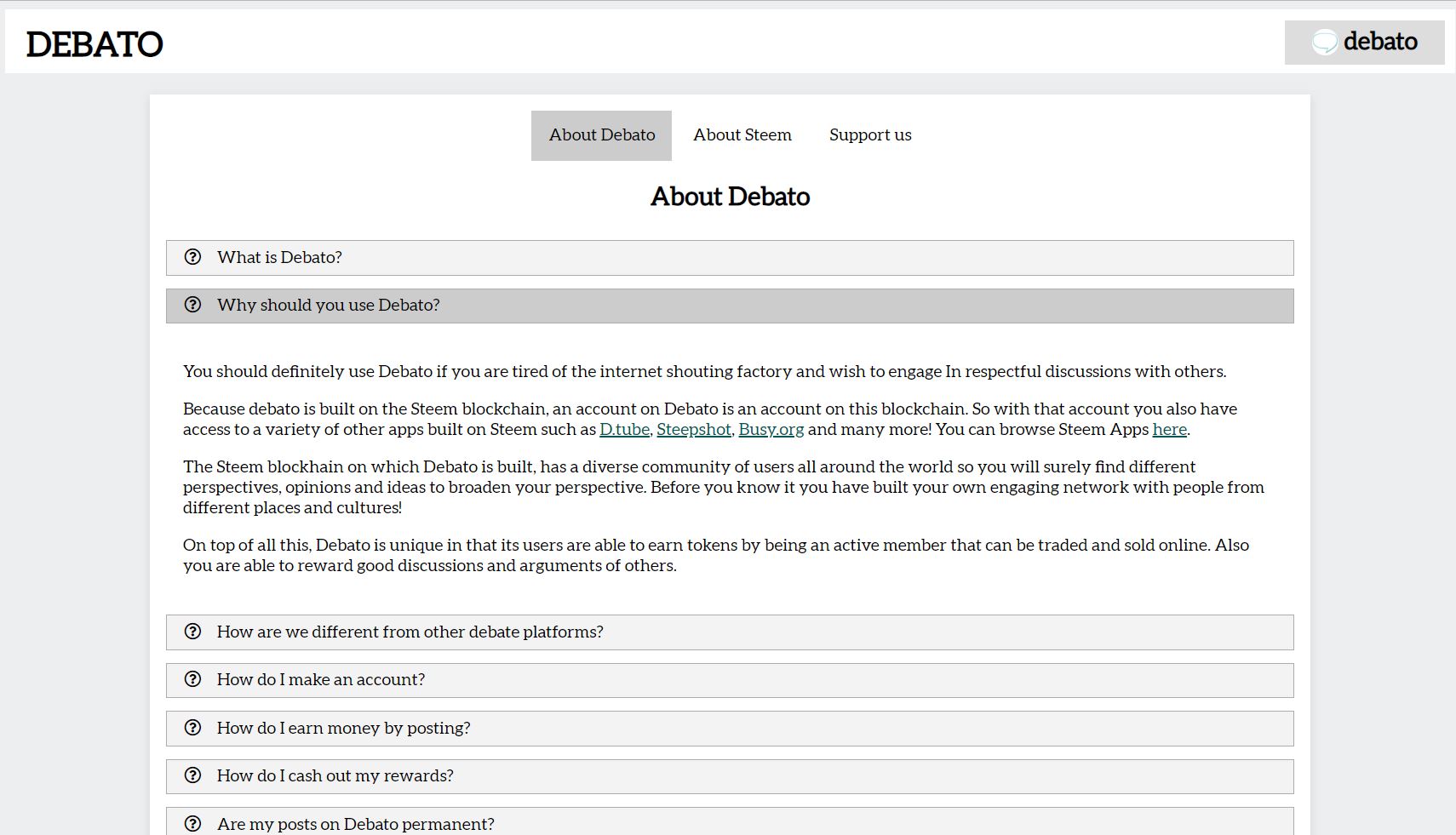 Debato is an online platform that accommodates online debates on topics big an small. We are all passionate about certain topics and inevitably it can happen that a difference in opinion leads to conversations that resemble a bottomless pit of arguments and acquisitions. This results in many people not even getting involved or finding it a waste of time to formulate their points of view. By filtering the thoughtful arguments and by structuring arguments and sub-discussions, debato allows anyone to share their thoughts and points of view in a clear way. And why stop there? Because debato is built on the decentralized Steem blockchain, writing thoughtful and interesting arguments or discussions gets rewarded as well.