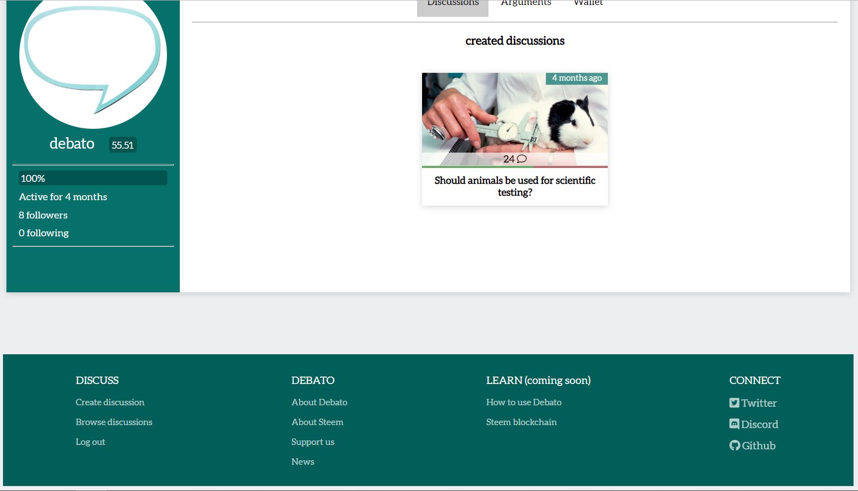 Website footer A footer at the bottom of every page gives you quick access to the most used features of Debato. It is a simple feature that can improve accessibility greatly. It also links to the main communication platforms such as our new twitter page, discord server or GitHub repository. There is already a space reserved for learning modules that go into more depth about learning how to properly use the argumentation structure and other features of Debato and Steem. These would quickly overcrowd the about section and deserve a page for themselves.