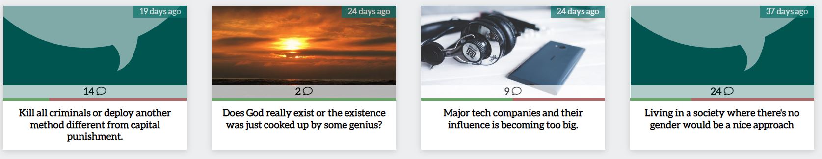 Status bar for discussion cards - When you browse discussions you will see a bar with a green and red color on the discussion card. This is an indicator for how many arguments are already posted pro, or against the statement. Its a nice indication to see the current status of a discussion or argument. Arguments also have this bar. The number that previously indicated this ratio now shows how many replies have been submitted to that statement (and sub statements) to indicate about the discussion activity.