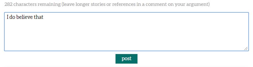 Character limit -To avoid people writing entire pages as an argument, there is an arbitrarily character limit of 300 characters. Arguments are ment as concise view points. To back those statements, the comment section should be used.