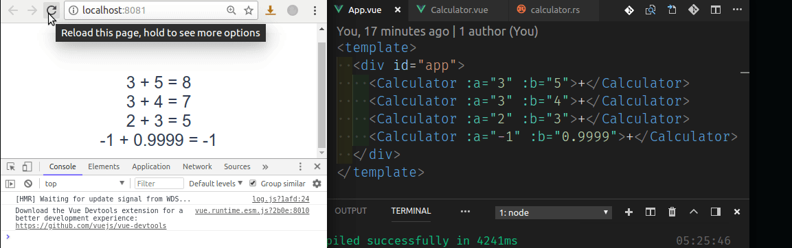 any change in your code (including your Rust code calculator.rs) is immediately compiled so you can see the change by just saving the file.