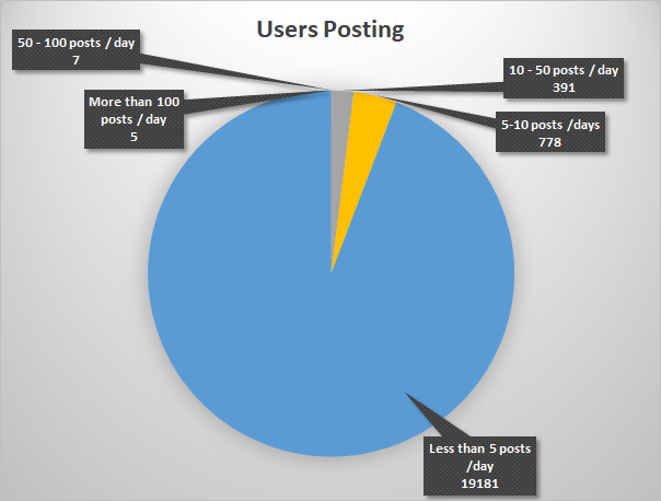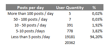 Slow-hours are 22:30 to 02:30 UTC with less than 1400 posts/hourWith an average of 2 post/day the distribution of posting frequency of uses are as follows.