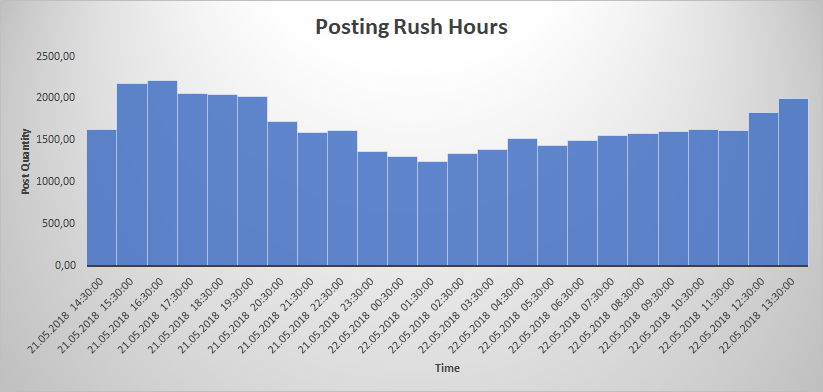 Rush-hours are from 15:30 to 19:30 UTC with 2000+ posts / hour