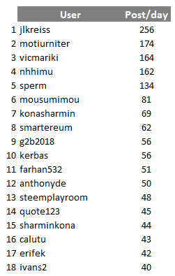 Hi @firedream, great work! However, I think the results have to be taken with a grain of salt. Around 24h is a rather short period, given that most users (at least those with original content and a life outside of Steem :) ) probably post less frequently than once per day. I know this is rather cumbersome and time consuming with direct blockchain access like SteemJS, but maybe SteemSQL could help to get a broader picture? Additionally, you've discovered quite a number of bots