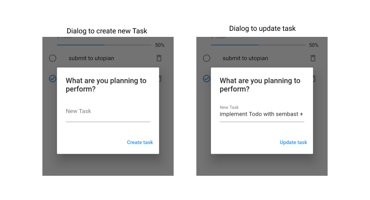 - Depending on whether the add new button or on tap of the list item was triggered, the appropriate UI for the dialog will be rendered. Also, the operation will differ, either adding a new task or updating it