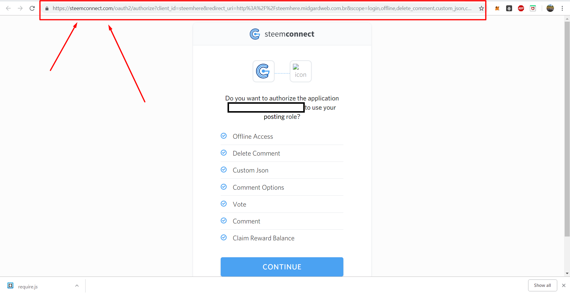 Mas, honestamente, eu nunca trabalhei com o requireJS antes, se eu adicionar essa linha antes o código vai quebrar, este é o momento perfeito para quem lê e sabe como fazer isso para contribuir com a série de tutoriais e ajudar a mim e ao outros leitores. Minha solução foi remover a linha de código (desculpe desenvolvedores da Steem Connect), atualizarei com um tutorial novo assim que aprender mais e tiver algo a ensinar sobre isso.