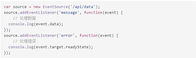上述代码中,我们创建了一个 EventSource 对象,并监听了 message 和 error 两个事件。当服务器推送数据时,会触发 message 事件并传递数据到回调函数中进行处理。如果连接错误或关闭,就会触发 error 事件,我们可以在这个事件回调函数中处理相应的错误信息。